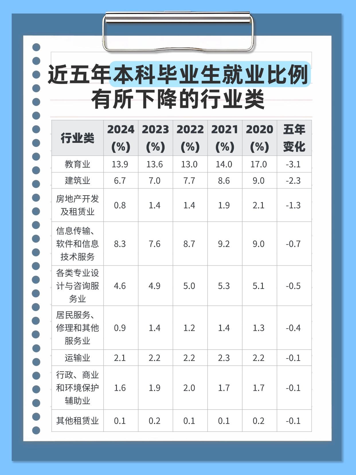 📉近五年本科生就业下降最猛的行业:教育、建筑!