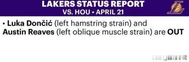 北京时间4月21日,洛杉矶湖人官方发布了季后赛首轮第二场他们主场迎战休斯顿火箭的伤情报告,卢卡-东契奇和奥斯丁-里夫斯将继续因伤缺阵。在系列赛G1与火箭的比赛中,湖人在东契奇和里夫斯双双缺阵的情况下主场107-98击败火箭,G2将在北京时间周三10:30打响。赛前湖人官方发布了系列赛G2的伤情报告,东契奇左腿腿筋拉伤,里夫斯左侧腹斜肌拉伤都将继续缺阵。