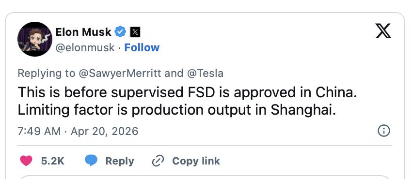 马斯克本人也做出了回应,“这是FSD在中国获得批准之前的情况。限制因素是上海的产能。”