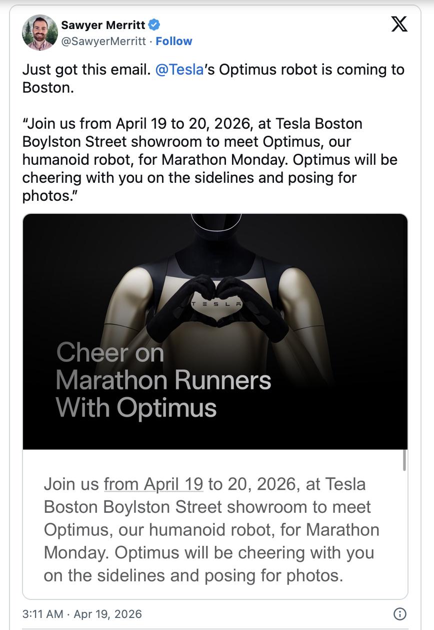 特斯拉机器人也要参加马拉松了,不过是作为吉祥物而非选手。特斯拉人形机器人Optimus将驻扎在位于波士顿博伊尔斯顿街888号的特斯拉展厅,这个展厅紧邻波士顿马拉松的终点线,届时它将为跑者加油助威,并与观众合影。