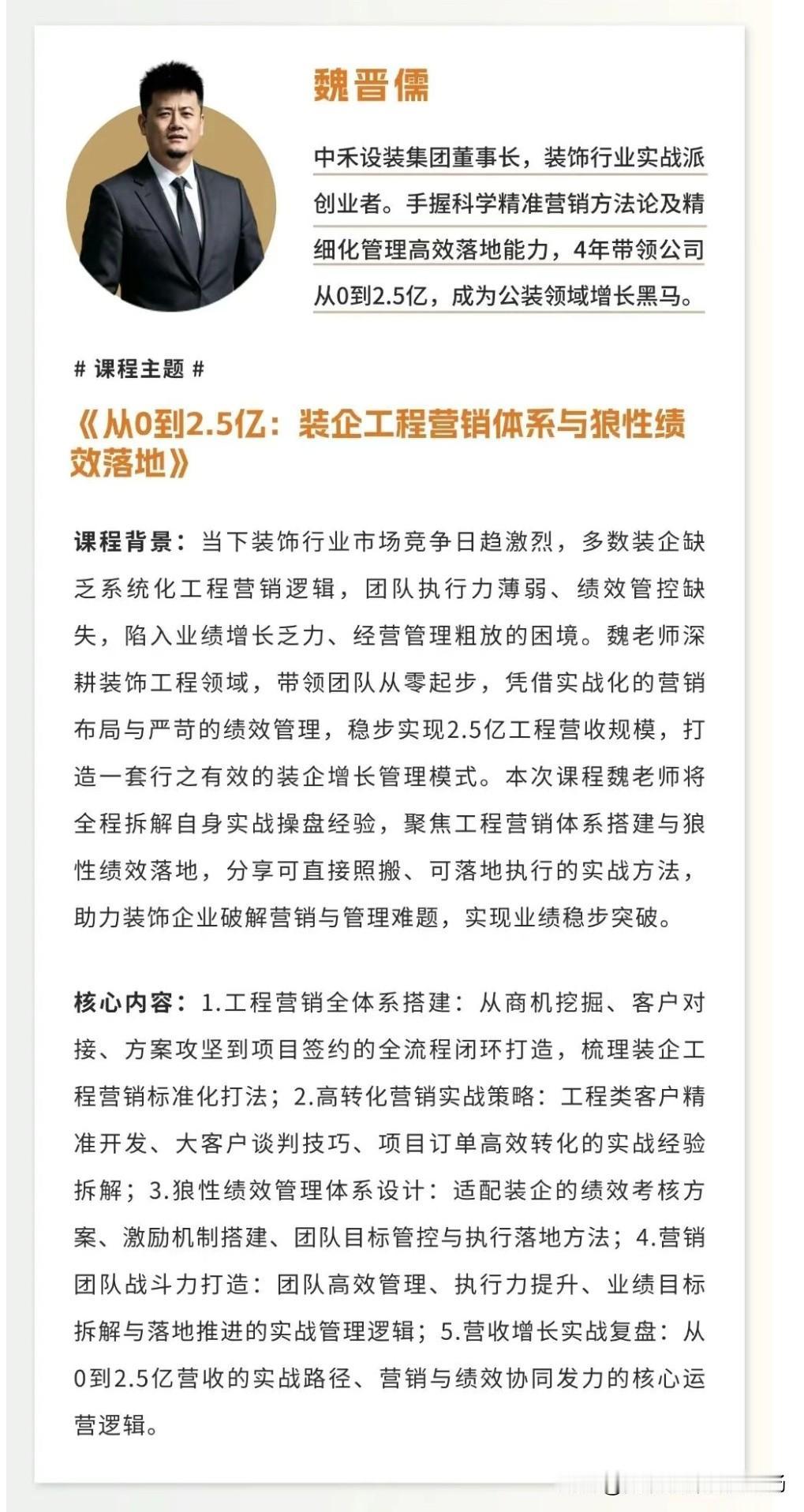 创业四年铸就2.5亿营收,装饰行业黑马;营销体系+狼性团队打造课程,获总裁班全体学员高度认可👍