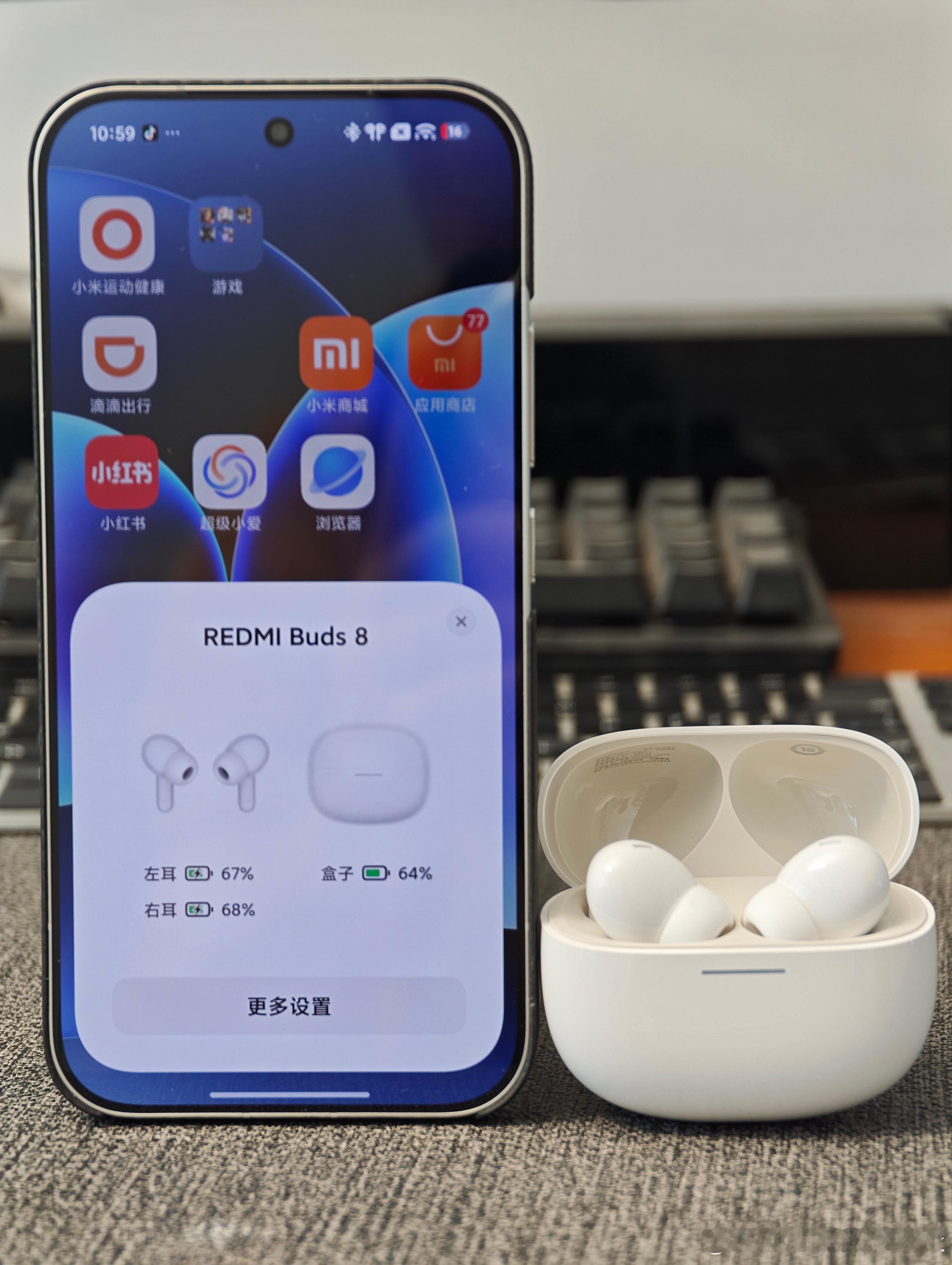 其他方面支持IP54级防尘防水,可以双设备连接和无缝协同,小米澎湃智联支持音频自动流转、音频共享与智能查找,续航单次能达到11小时,支撑一天的中度佩戴完全没有问题。不得不说REDMI Buds 8把大家最关注的舒适和降噪两大痛点在这个价位给针对性解决了,说它是同档最值得入手的入耳式降噪耳机真没毛病。REDMIBuds8舒适降噪王