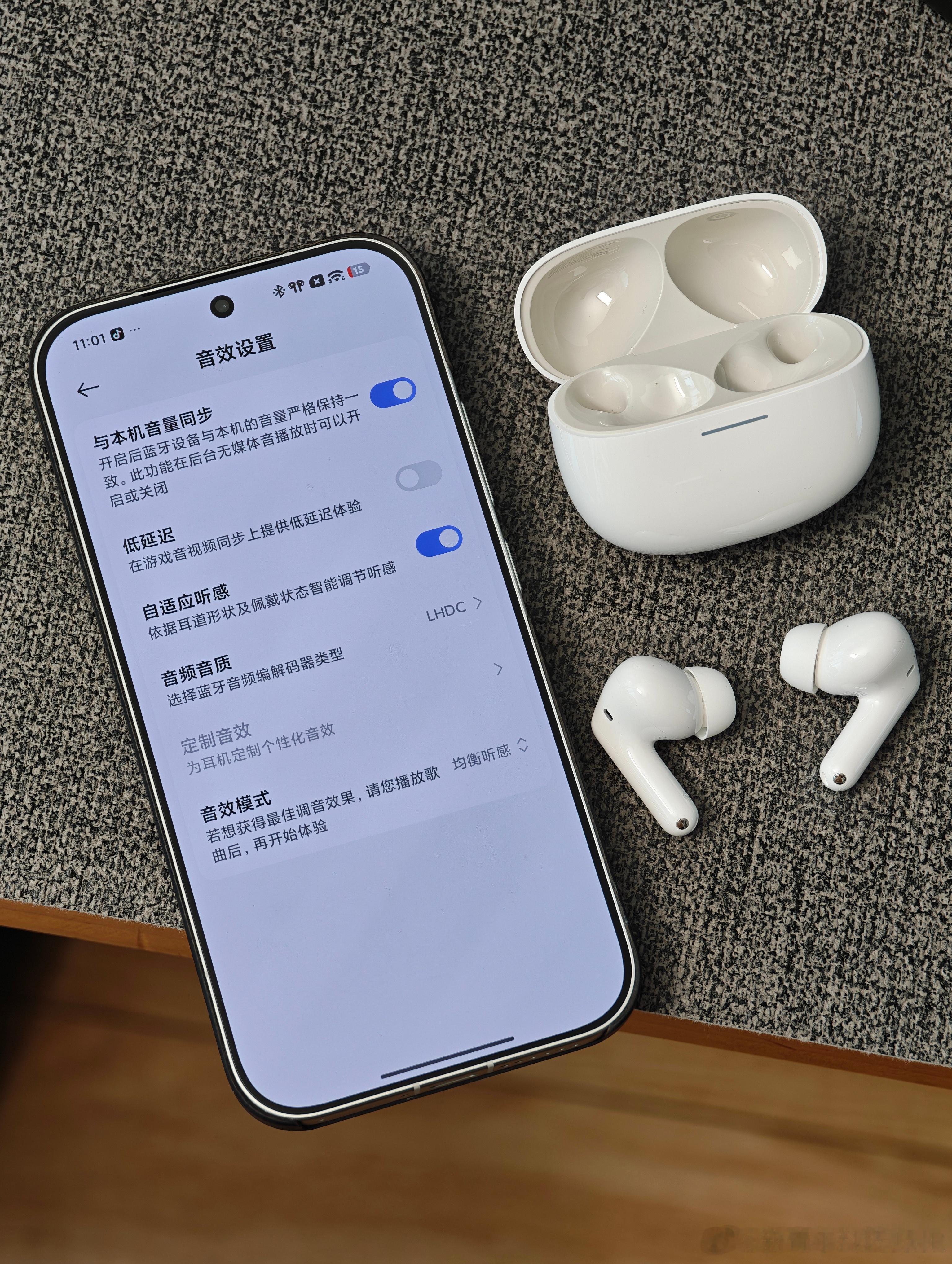 音频素质方面,11mm高性能动圈单元+复合振膜,并且支持SBC、AAC以及升级LHDC 5.0高阶编解码,Hi-Res金标认证,实测听歌对比同档来说,人声会更加透亮、低频下潜很明显,不会很闷属于耐听的类型,还能够自己进行个性化的调音。