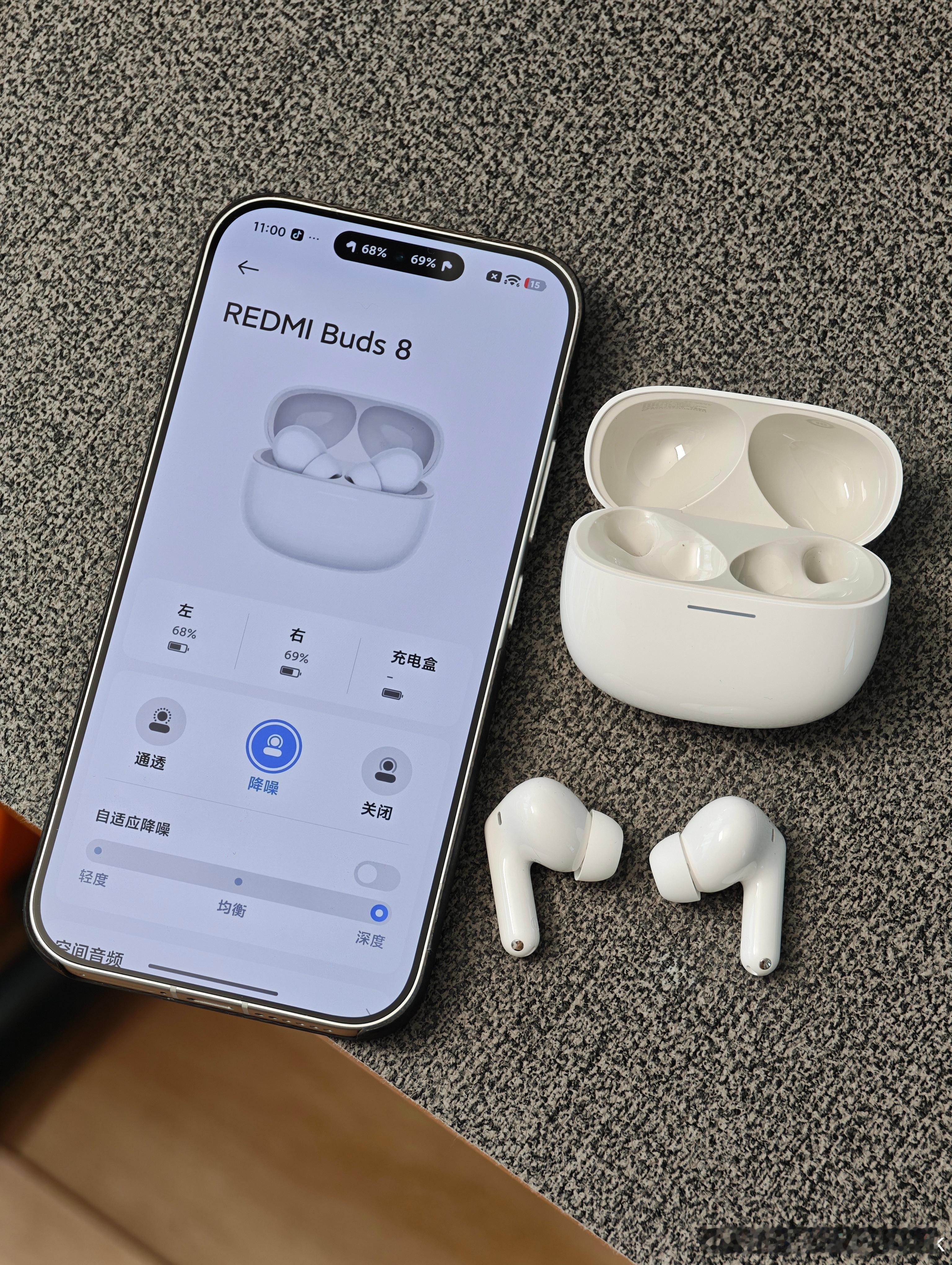 日常出行通勤最常用的降噪方面,这次REDMI Buds 8升级不小,50dB/4kHz宽频主动降噪,整机支持深度降噪、均衡模式、轻度模式三种预设场景,一般我在飞机和地铁都用的是深度降噪,效果确实不错,此外还提供了耳道个性化降噪技术