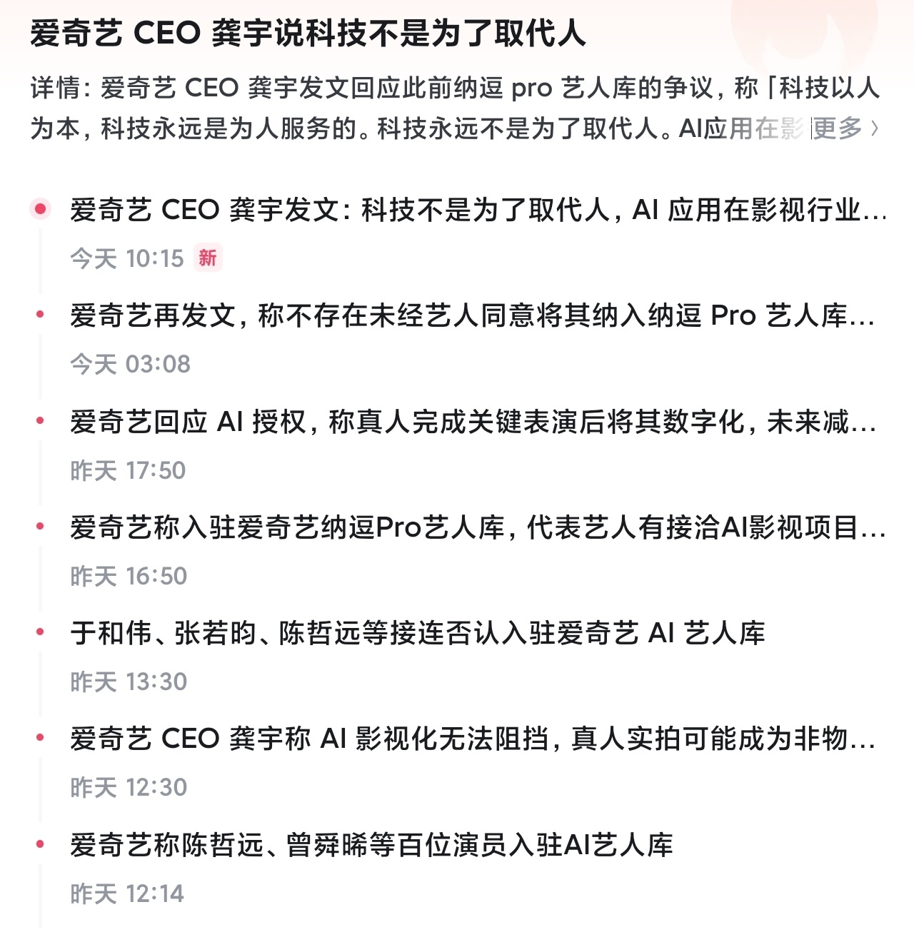 这种技术变革,模式创新挡不住,抵制爱奇艺的,为啥不抵制红果?Ai艺人以后有Ai粉丝,艺人的价值会大大降低,平台想让谁火,谁才有价值,这件事其实抵制的只有艺人和粉丝,而不是观众。爱奇艺CEO龚宇发声爱奇艺 观众要看真人