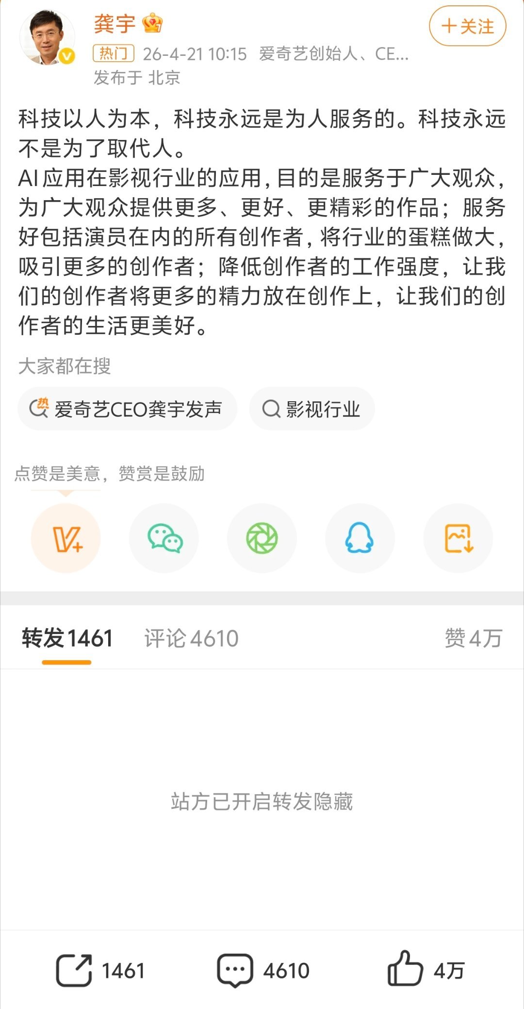 爱奇艺CEO龚宇发声 关于爱奇艺CEO发声:是想为广大观众提供更多更好更精彩的(Ai)作品!但是网友们不可以发声
