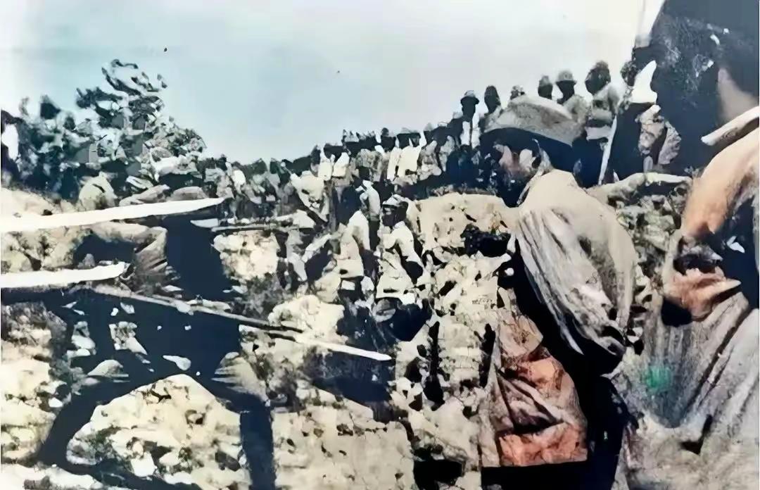 侵华战争期间,被日军俘虏的战士们,遭到集体屠杀。战士们在受尽折磨后,被反绑了双手,带到了早已挖好的土坑里。几名日本士兵手拿刺刀,奋力地朝他们刺过去。围观的日本士兵密密麻麻围满了四周,这凶残的一幕,对于他们来说似乎早已司空见惯。
