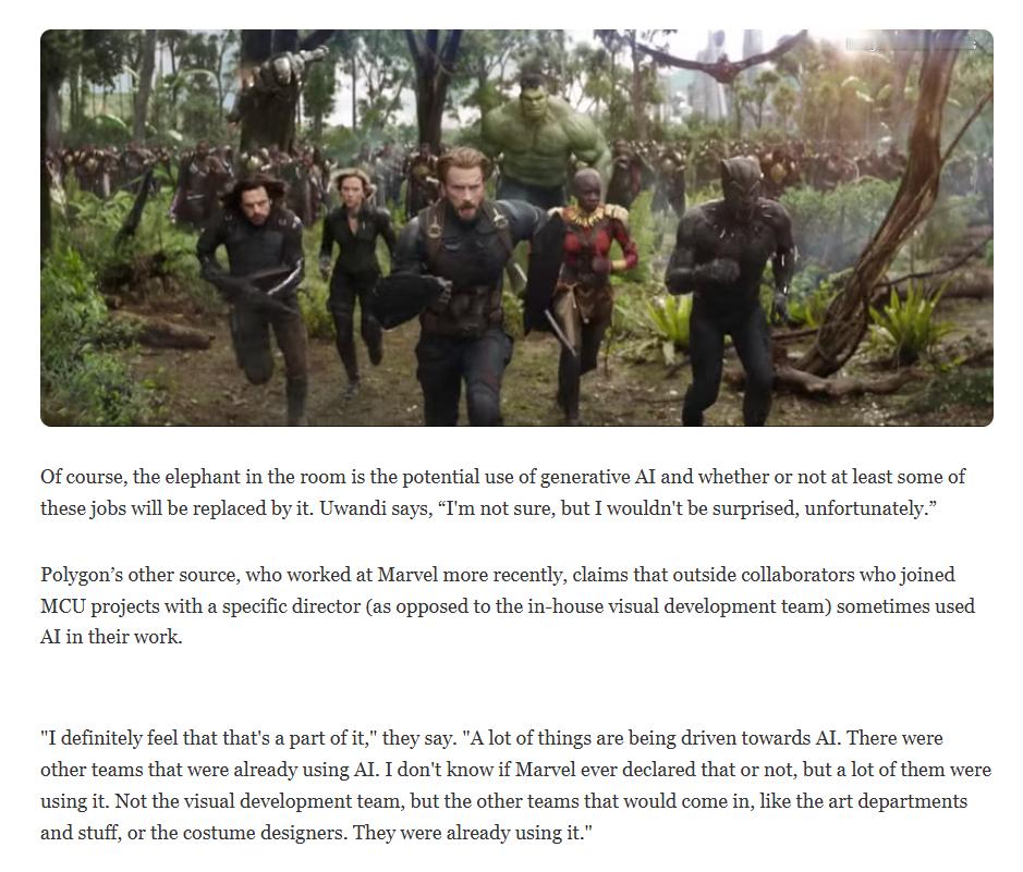 “我绝对认为这是其中的一部分,很多事情都在朝着人工智能的方向发展。其他团队已经在使用AI了。我不知道漫威是否公开承认过这一点,但很多团队都在使用。不是视觉开发团队,而是其他参与的团队,比如美术部门、服装设计师等等。他们已经在使用了。”