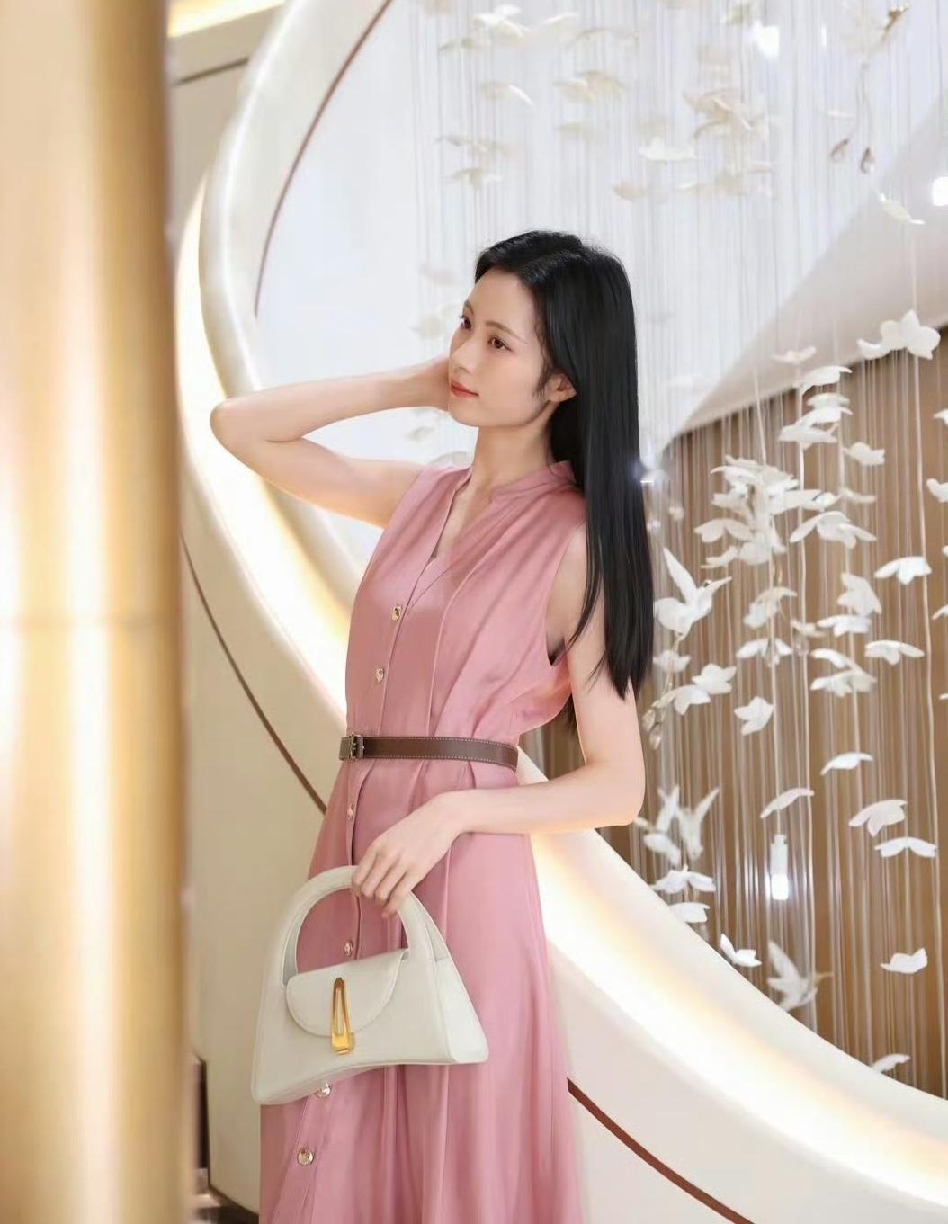 柔粉色连衣裙像把春日的甜意裹在身上,腰带一收,把身段衬得恰到好处。米白手袋和裸色