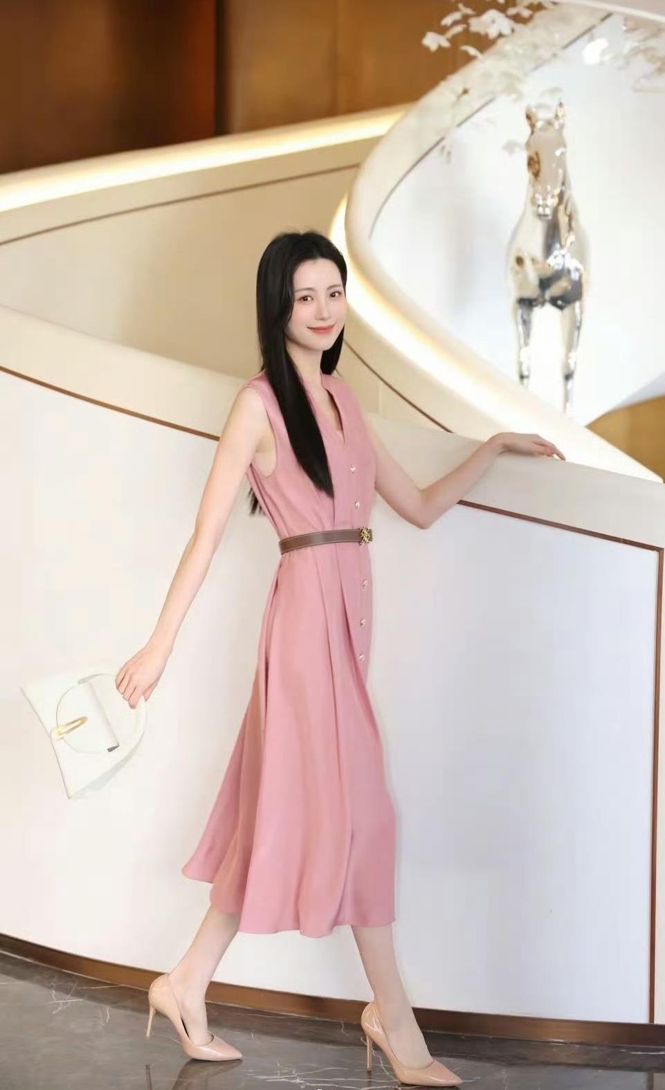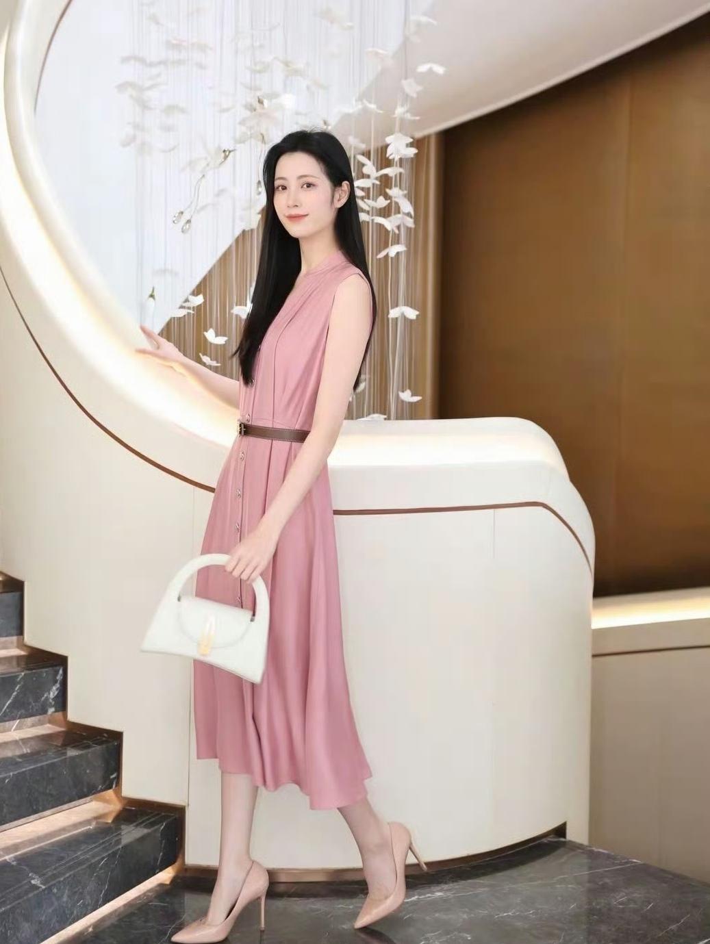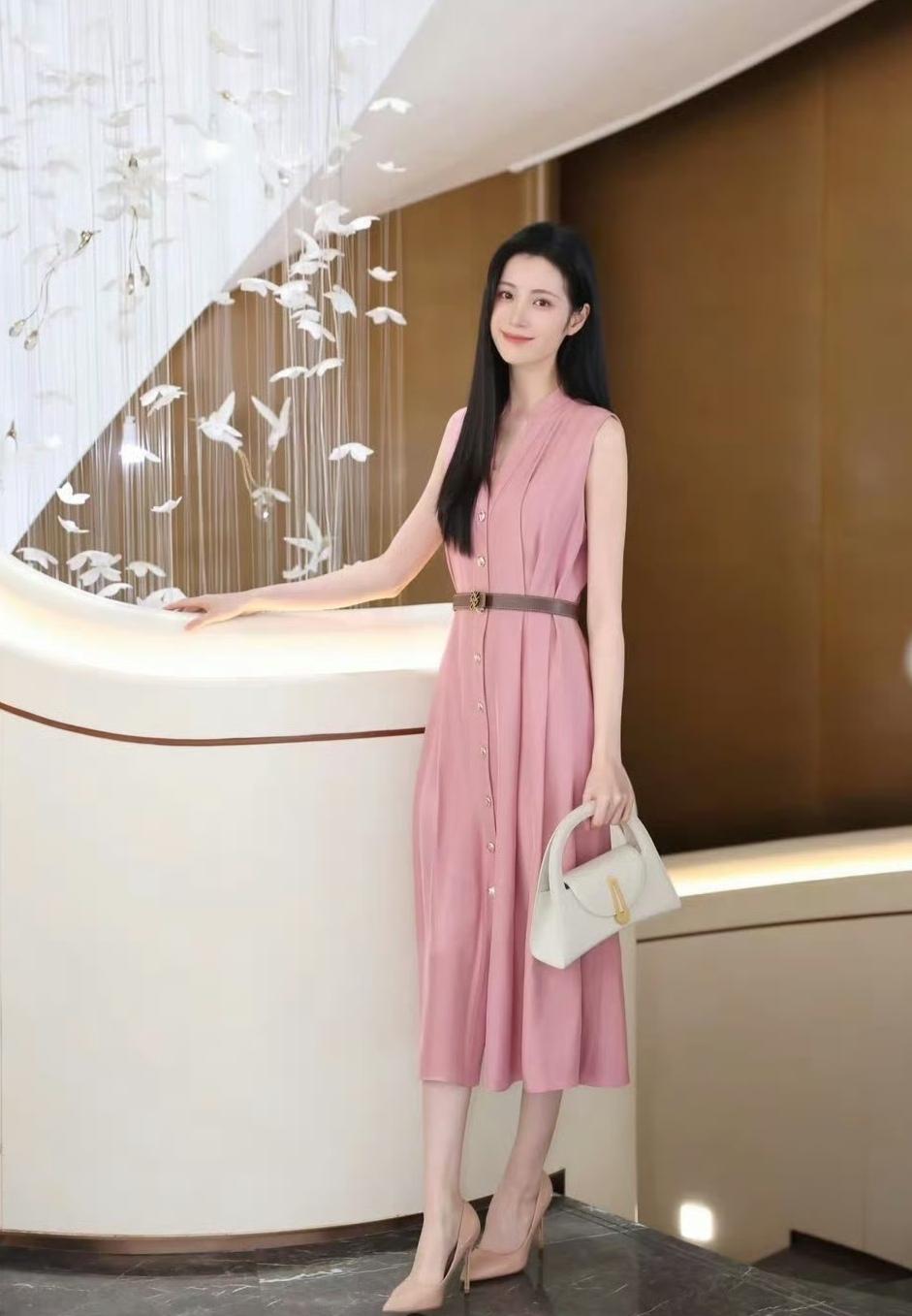 柔粉色连衣裙像把春日的甜意裹在身上,腰带一收,把身段衬得恰到好处。米白手袋和裸色高跟鞋一搭,优雅得像幅温柔的画~