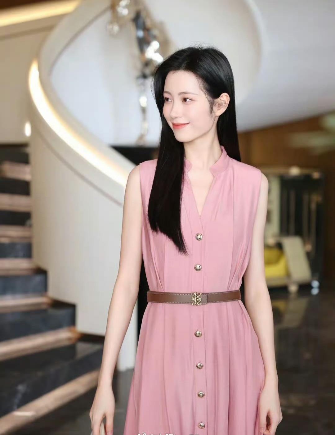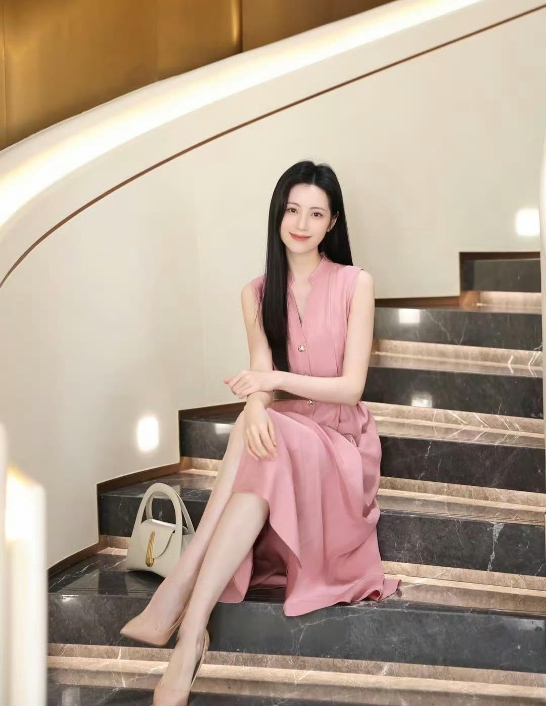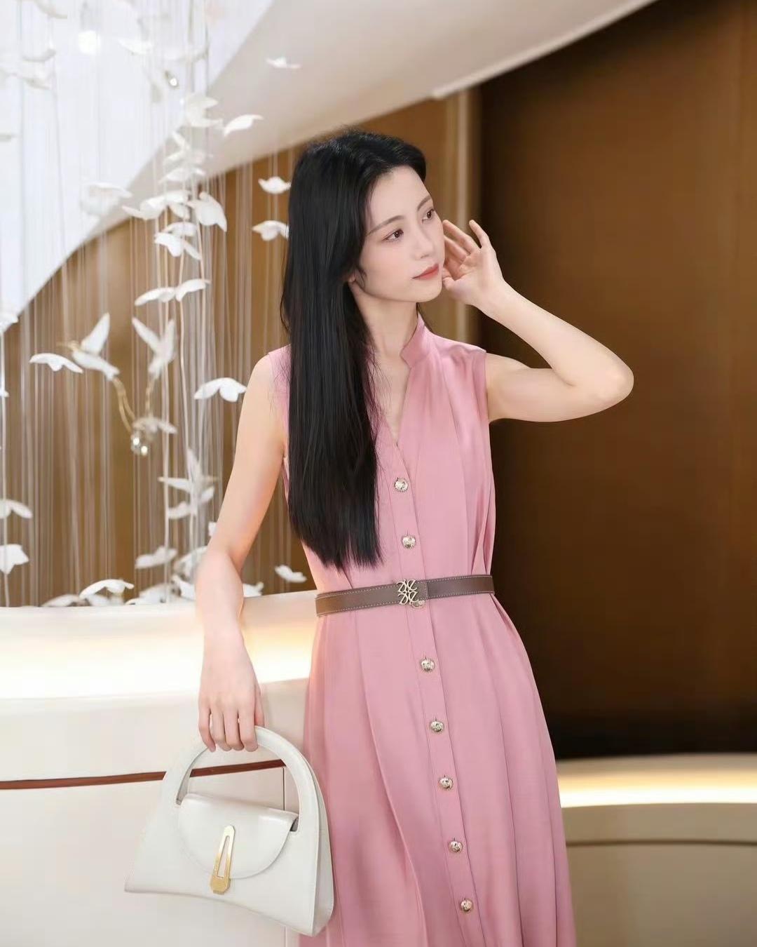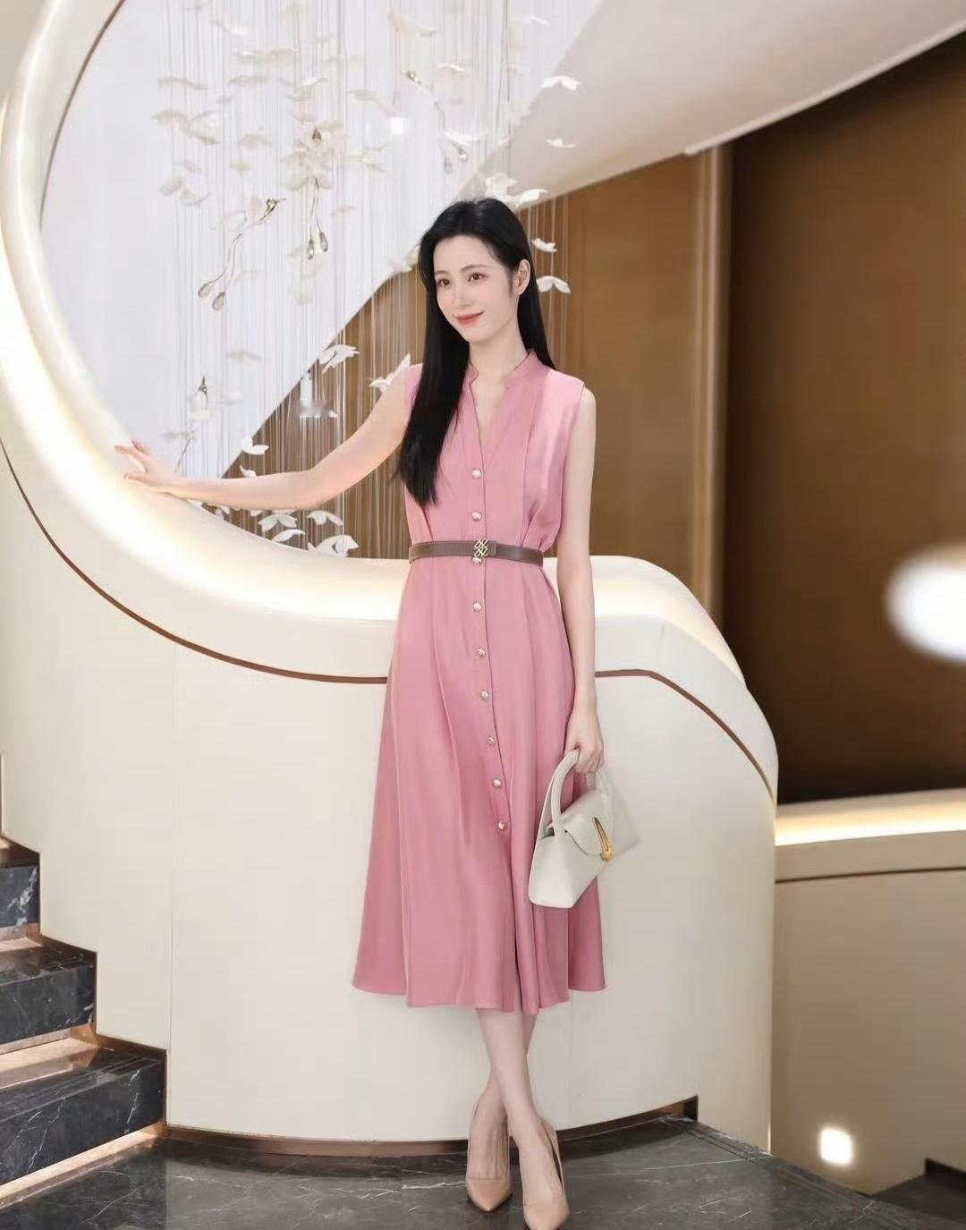 柔粉色连衣裙像把春日的甜意裹在身上,腰带一收,把身段衬得恰到好处。米白手袋和裸色高跟鞋一搭,优雅得像幅温柔的画~