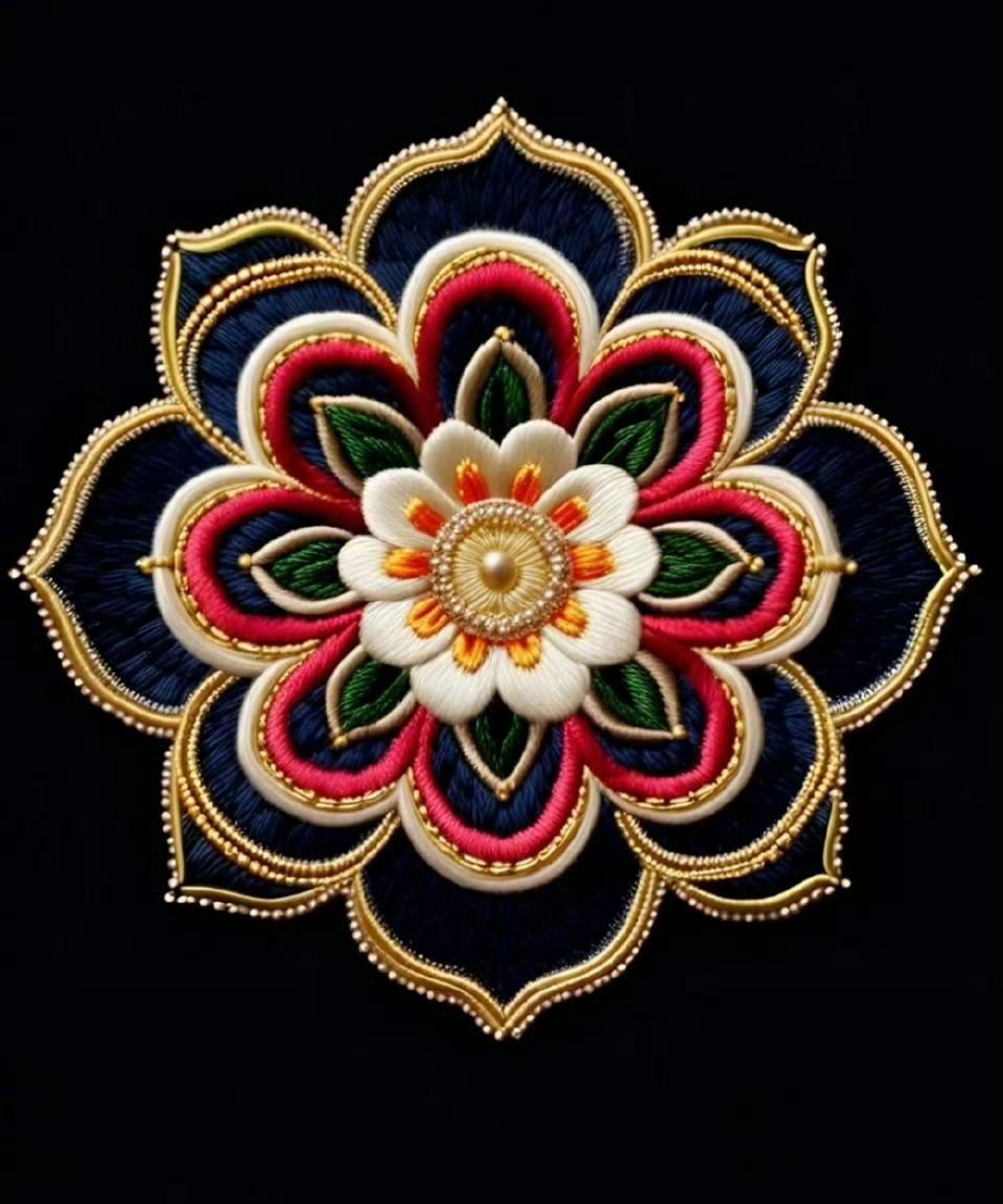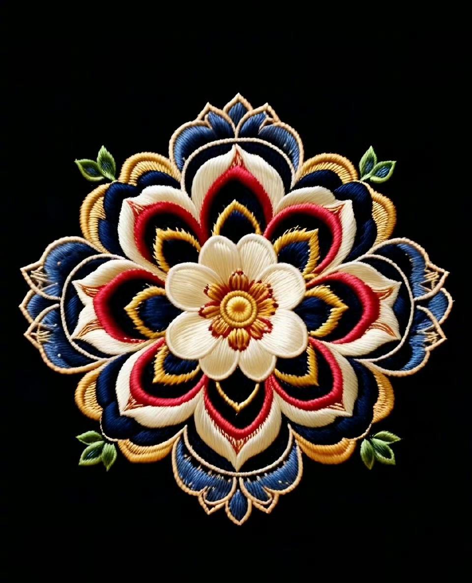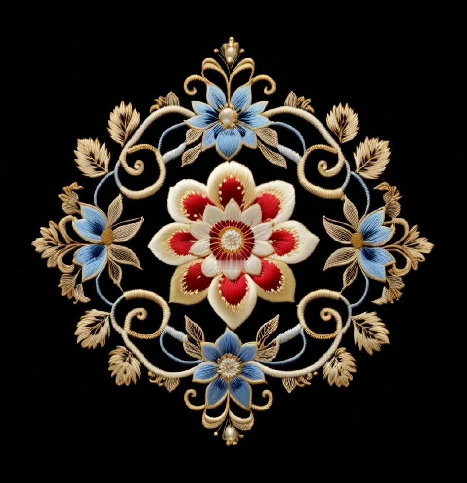 图 2:多层曼陀罗对称宝相花,红、藏蓝、明金撞色叠加,层次饱满立体,是融合民族刺绣与古典宝相花的浓彩华丽纹样。