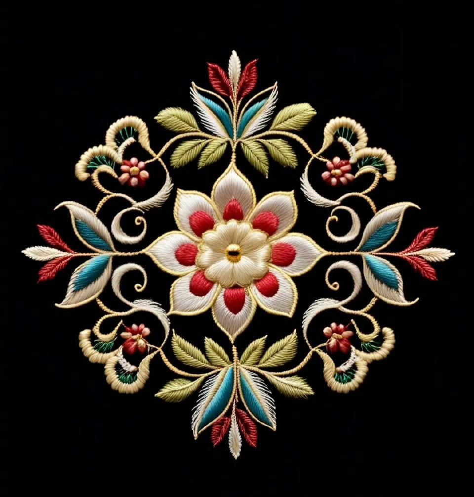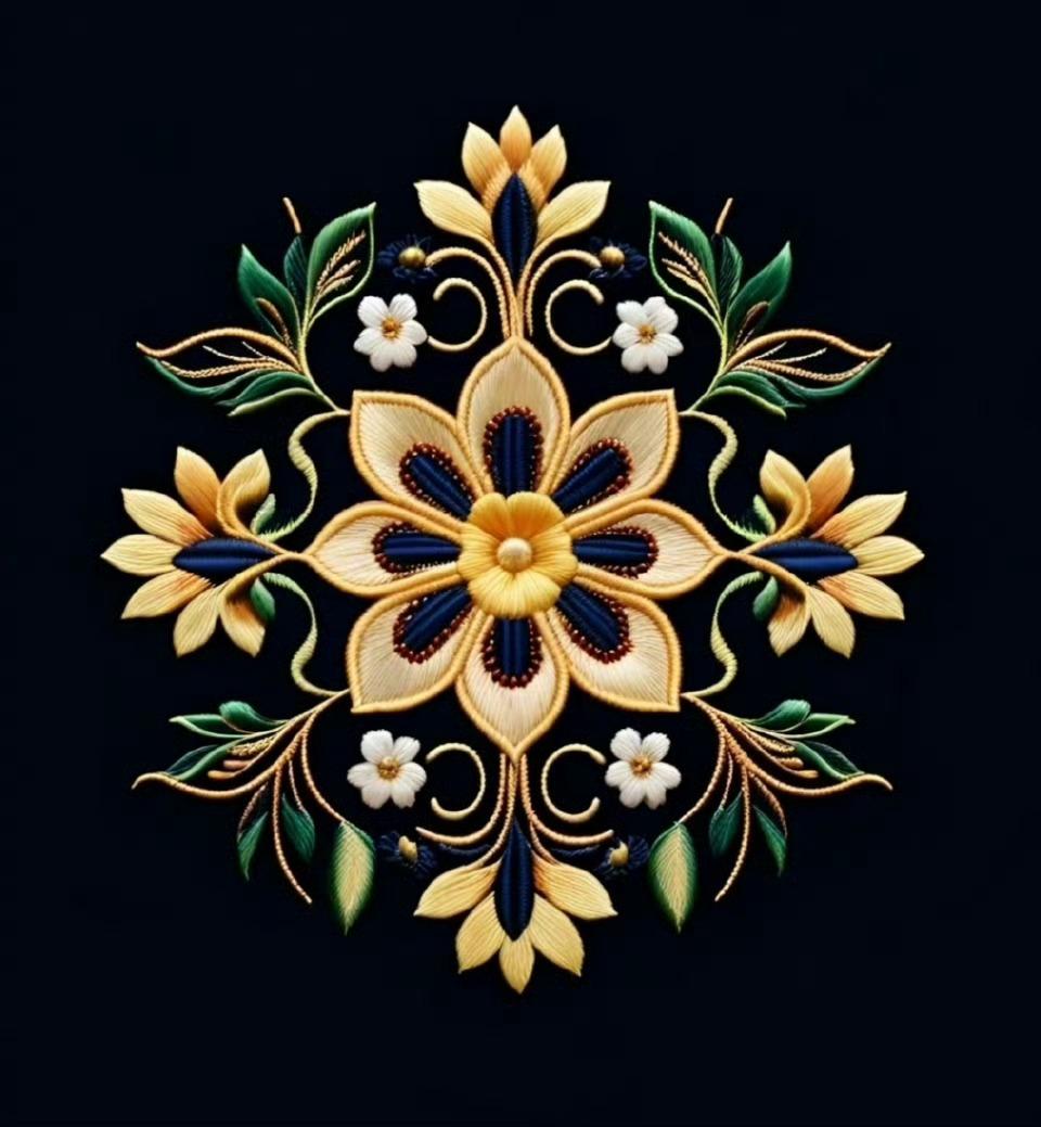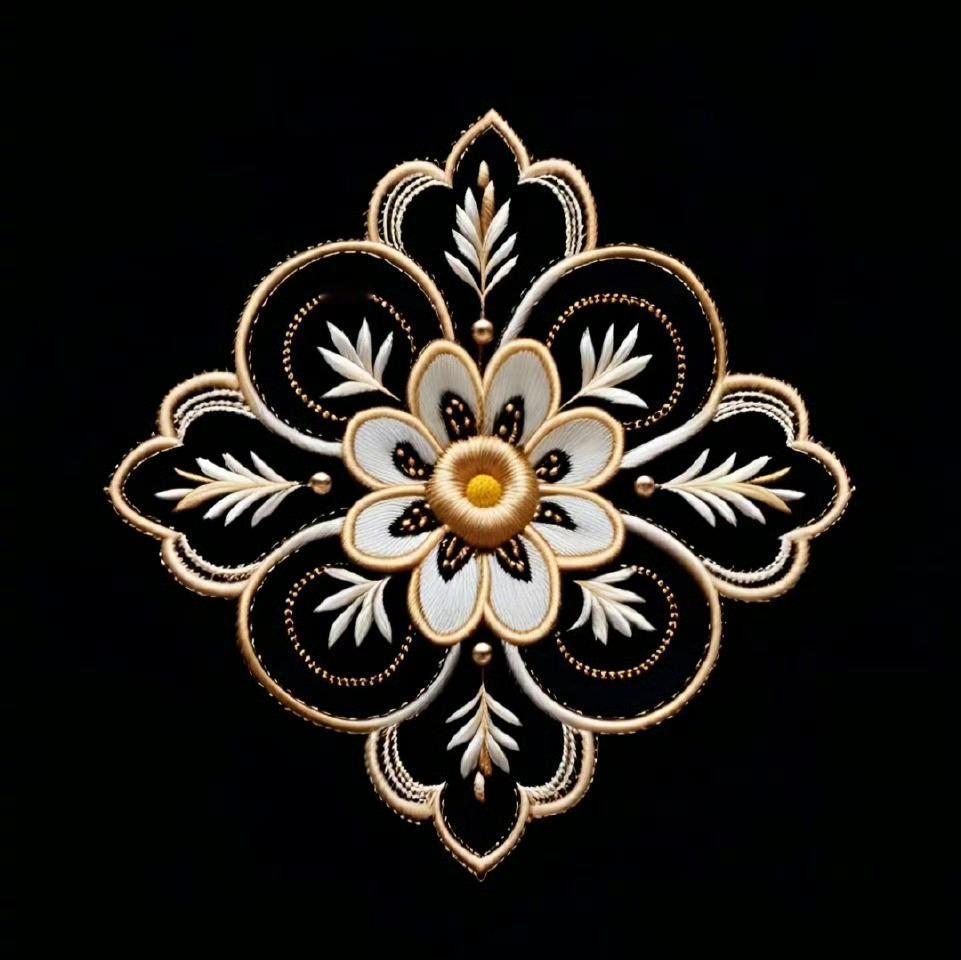 图 5:菱形四向对称花芯纹样,黑金底色衬米白绣线,极简枝叶 + 金色花蕊,复古轻奢,线条利落又克制耐看。
