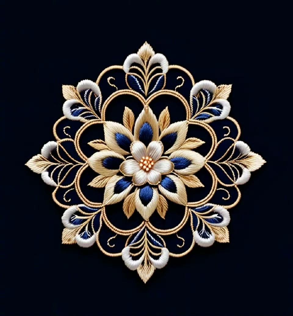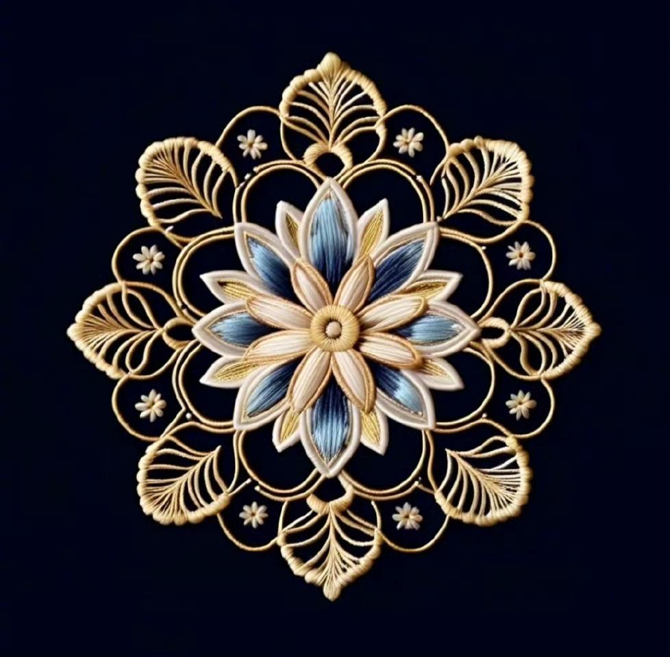 图 6:八出放射状团花,金线条勾勒镂空花叶轮廓,中心渐变蓝金莲花,外围点缀迷你小白花,轻盈通透,温柔灵动。