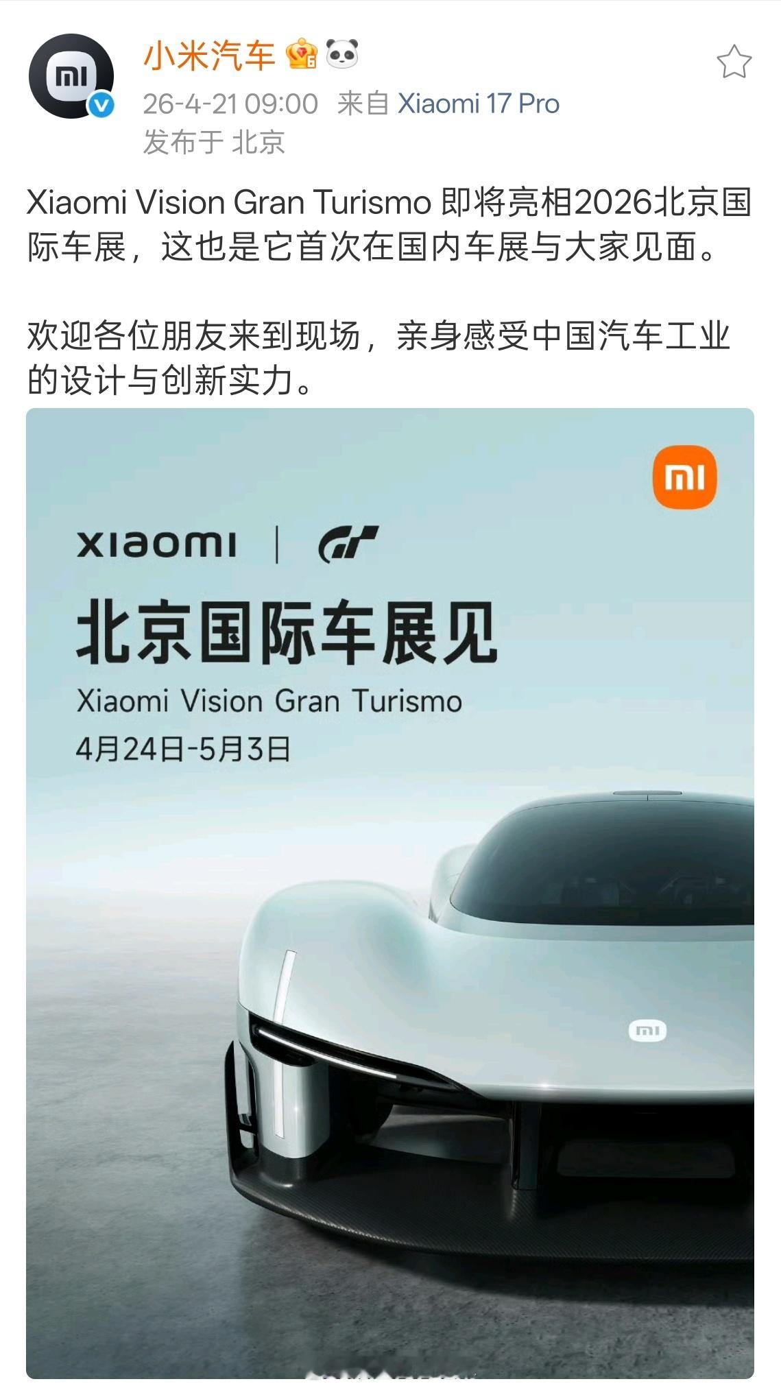 Xiaomi Vision Gran Turismo 即将亮相2026北京国际车展,非常羡慕去现场参加北京车展的媒体老师了。