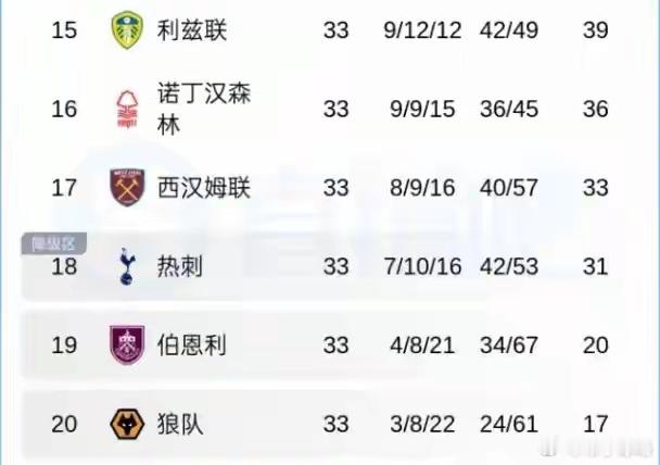 积分榜上,利兹联、诺丁汉森林、西汉姆联分列15至17位,积分相互拉开3分差距。热刺身陷降级区,距离安全区的西汉姆联仍有2分分差,突围压力巨大。
