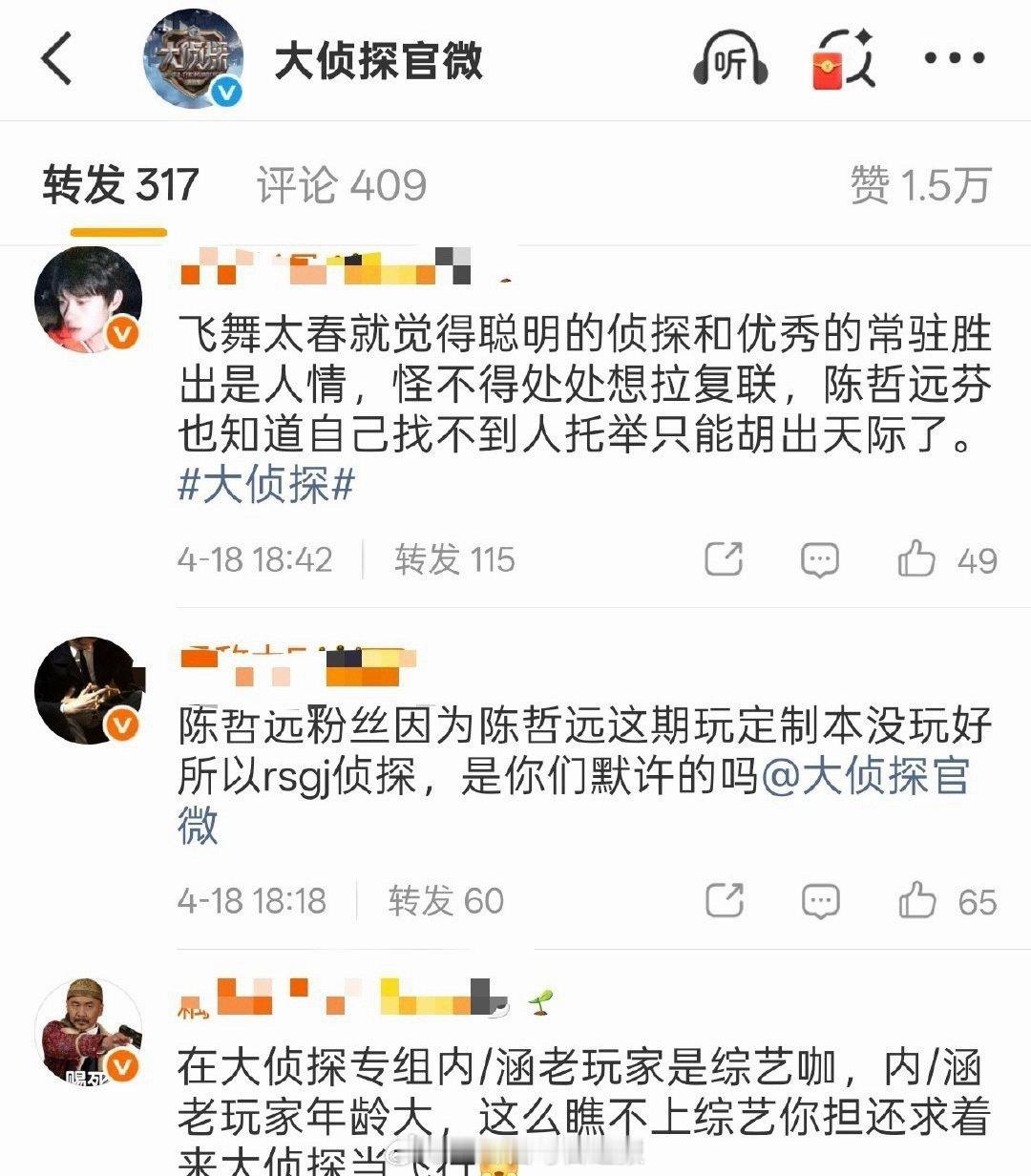 陈哲远粉丝、魏大勋粉丝在大侦探官微排字!起源是两人参加大侦探,投凶环节陈哲远投对了,魏大勋投错了,现在两家都说是对方影响了游戏