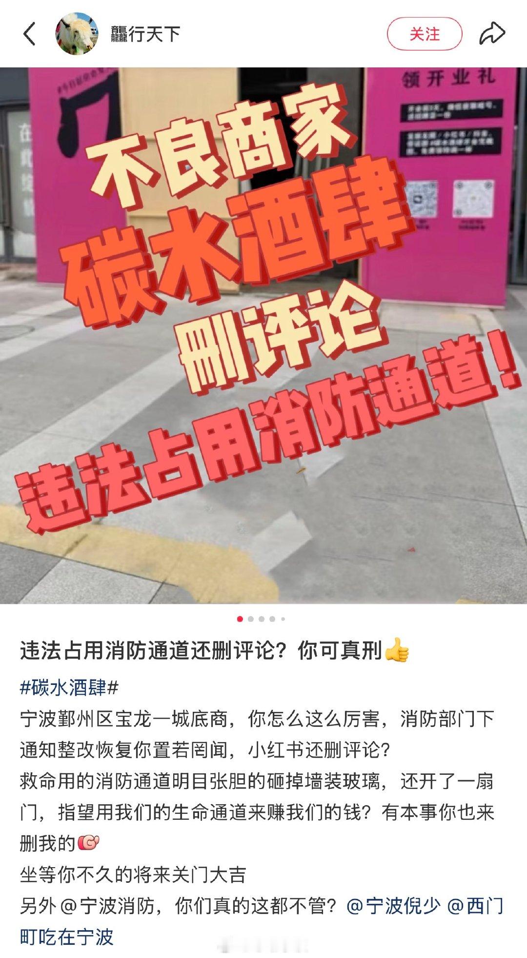 宁波网友反映宝龙一城一商铺占用消防通道 网友“龘行天下”爆料:宁波鄞州区宝龙一城小区东门的消防通道被商铺占用,存在消防安全隐患。(本文信息来源为网友爆料,刊载此文仅为提供更多资讯信息,并不代表本号同意文中的说法或描述,也不构成任何建议。)