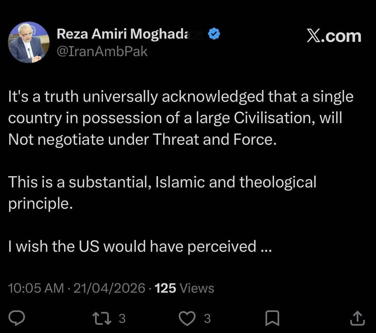 4月21日,伊朗驻巴基斯坦大使穆加达姆公开发声,明确表示伊朗绝不会在威胁和强迫下跟美国谈判,直接戳破了美国想靠施压逼伊朗妥协的幻想。(新华社)