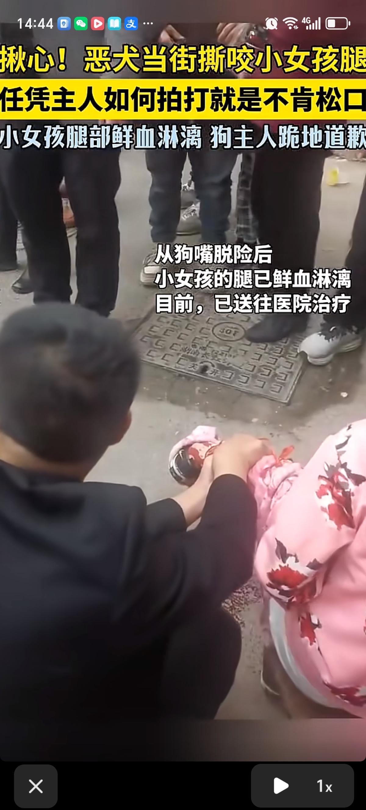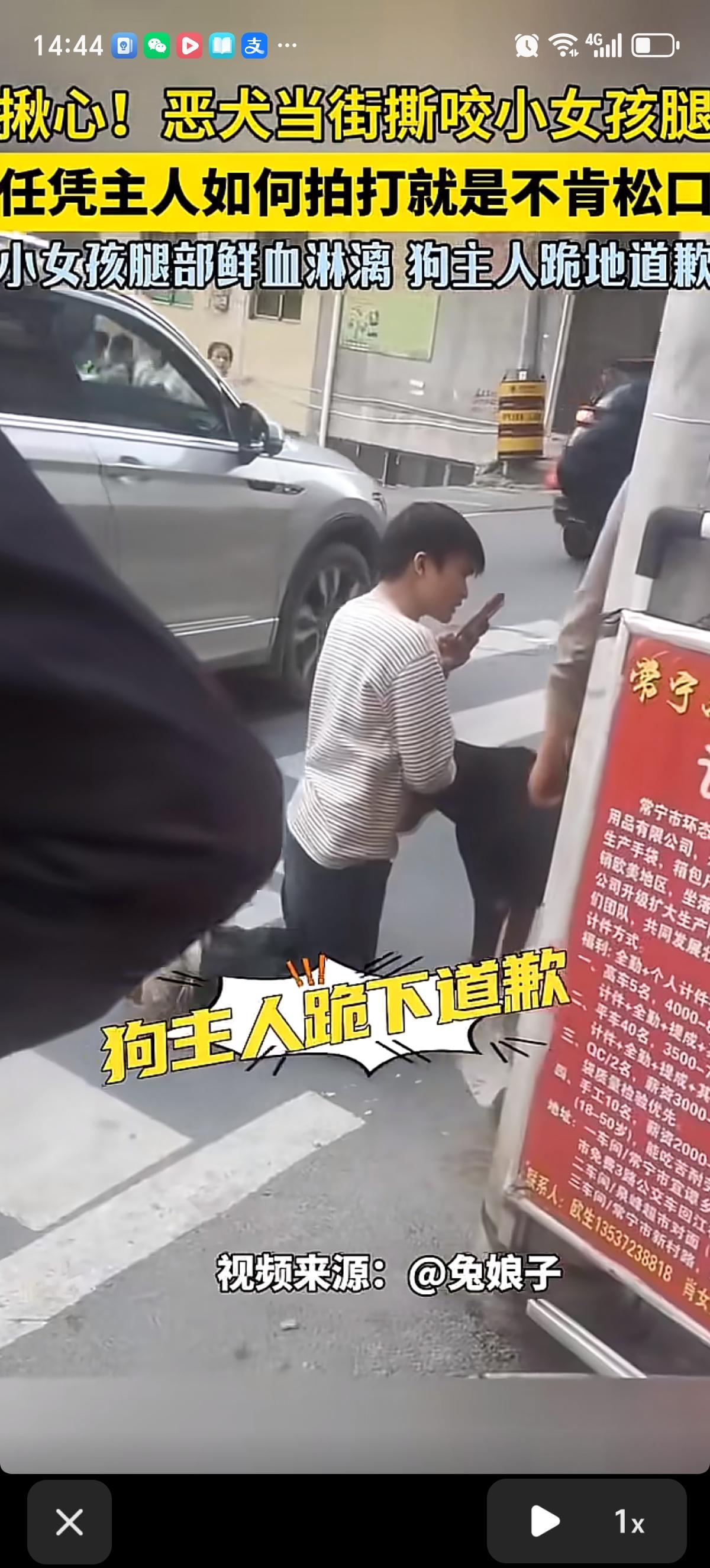 湖南常宁街头一条大黑狗死死咬住女孩的小腿,任凭狗主人尽全力拉扯、拍打,就是不松口,周围人不敢贸然上前。事后狗主人跪下道歉,女孩腿被咬的血淋淋的,被紧急送医治疗。
