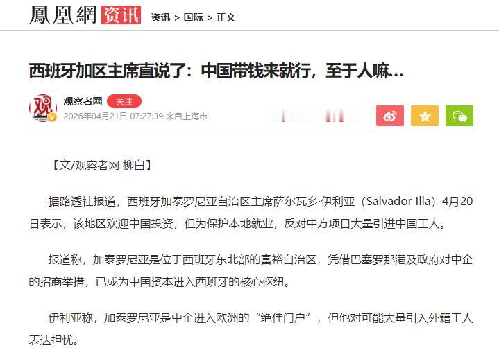 西班牙加区主席直言:中国带钱来欢迎,带工人来不行 4月20号,据路透社报道,西