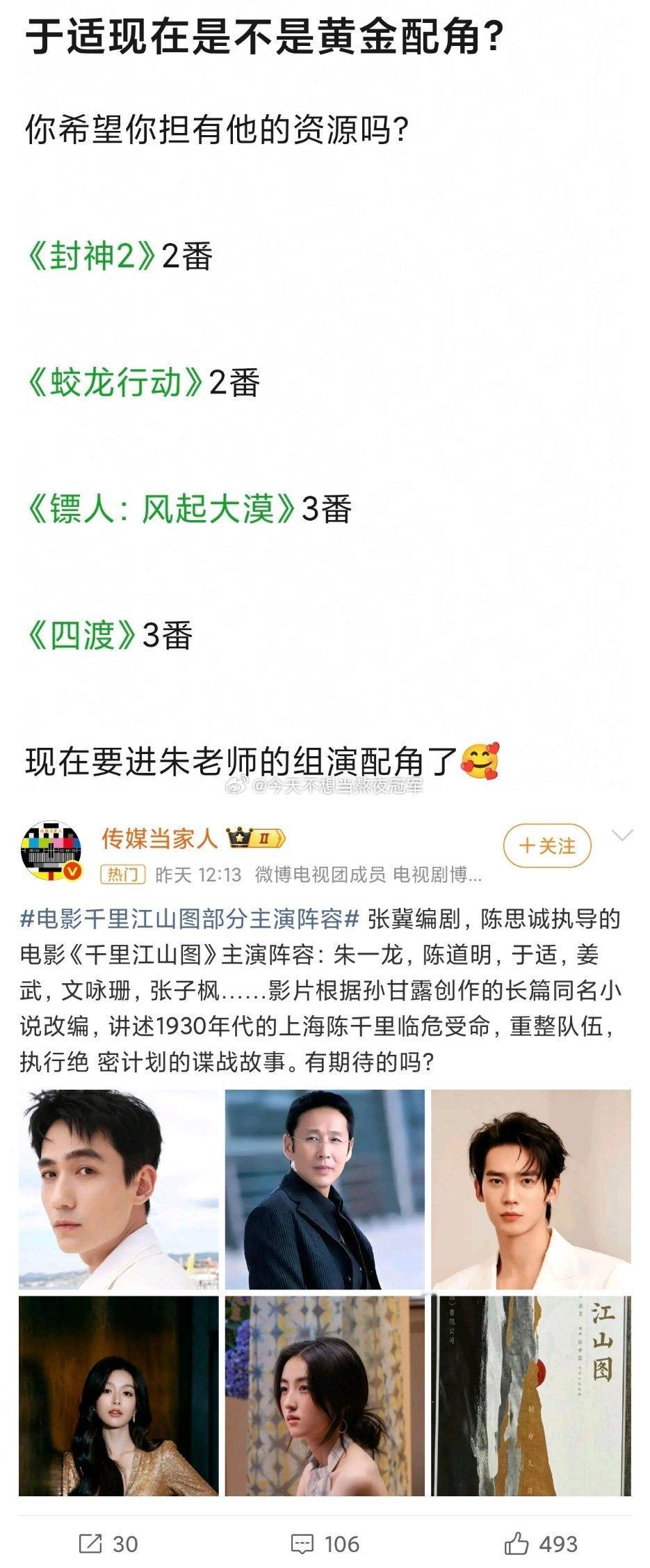 于适 网传即将进组朱一龙新电影《千里江山图》演男三。 有网友问,于适现在是不是大制作电影的黄金男配专业户? 你愿意给你担接🍅的zy和角色吗