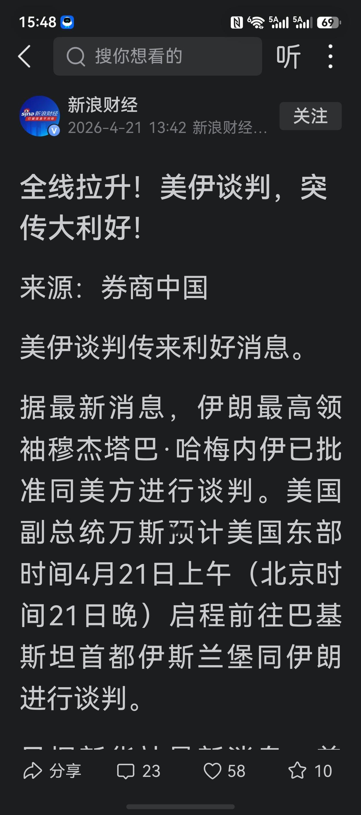世界终将和平,股市终将上涨!明天会是一个好日子,百点长阳可期,基民股民就等着狂欢吧!今天是一个很无聊的日子,消息面杂乱无章,美伊是否谈判扑朔迷离,股市涨也不是跌也不是,最后选择了横盘整理。但继续战争不是特朗普想要的,更不是伊朗想要的,和谈是唯一选择!所谓的伊朗不准备进行第二次和谈,只不过是一个谈判筹码,最终目的还是为了和谈。明天的谈判已是必然!继续停火也是必然!明天股市大涨也是 必然!