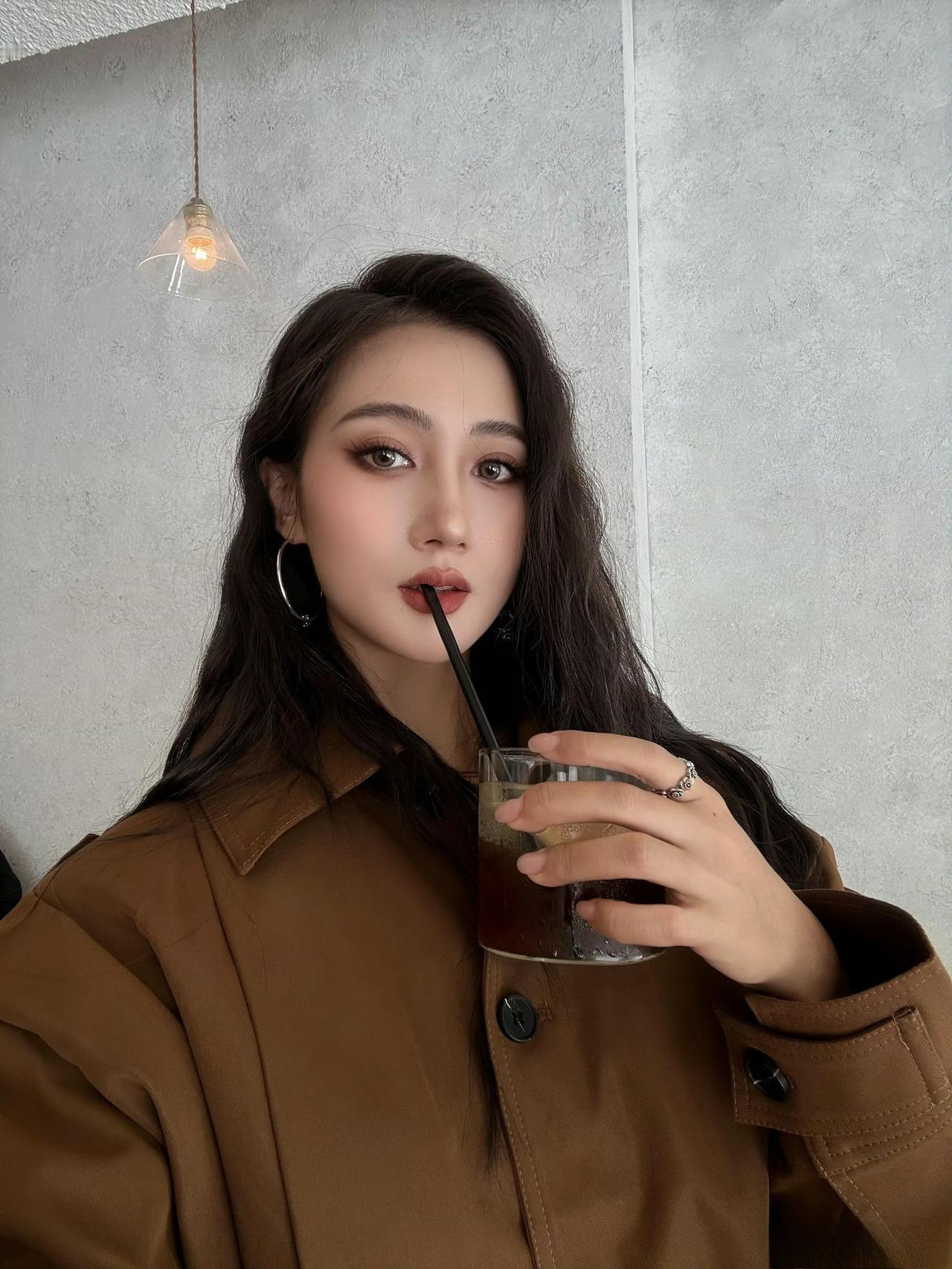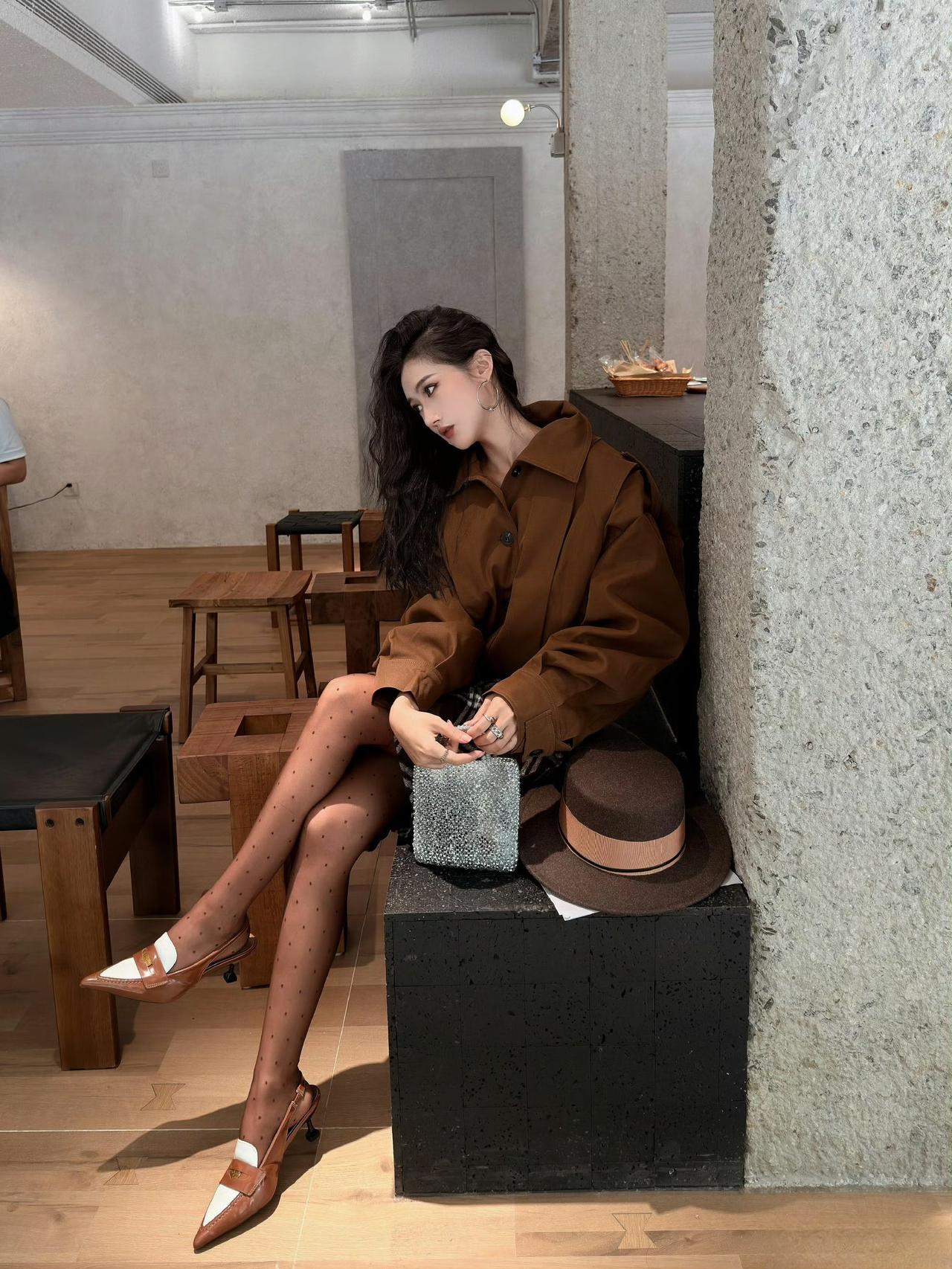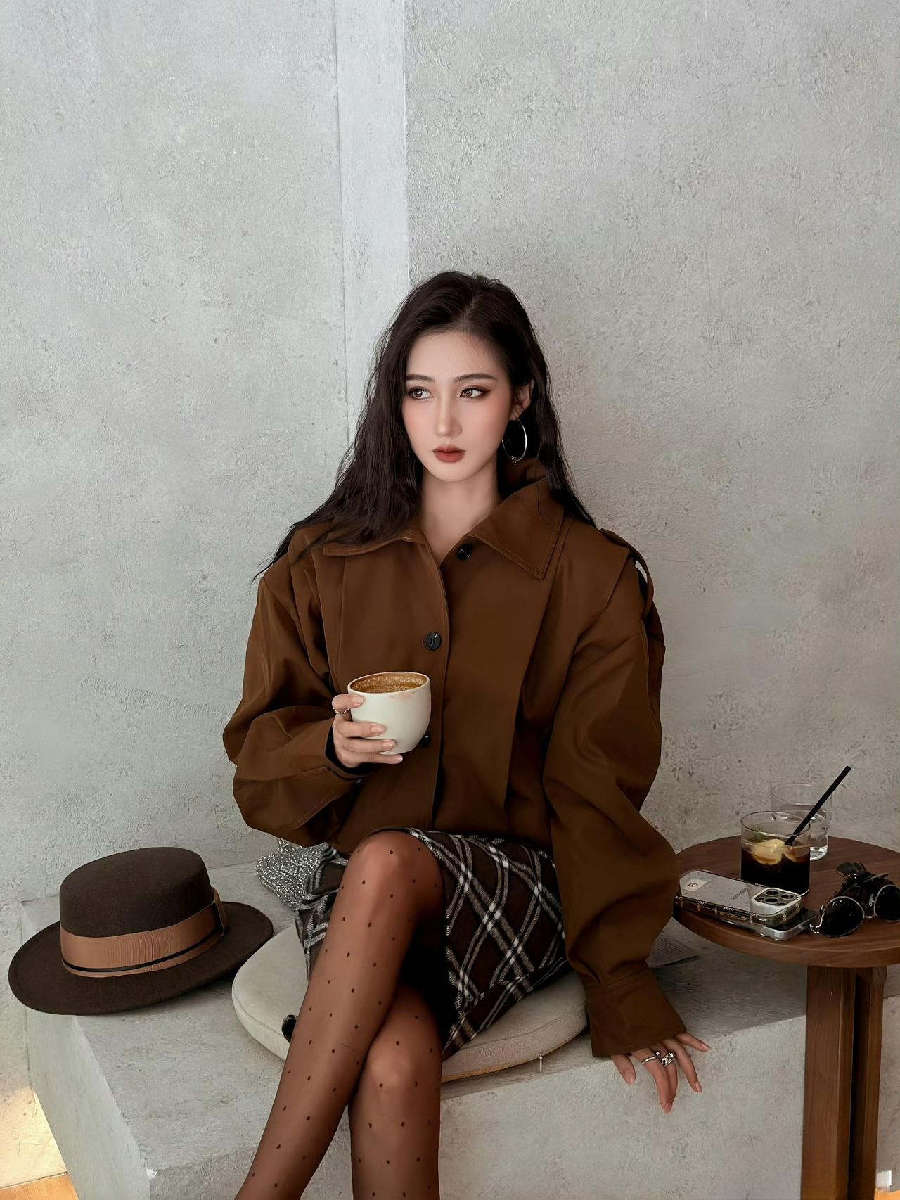 - 上衣选了焦糖棕短款宽松外套,oversize版型带松弛感,短款设计显高,棕色调适配秋冬;