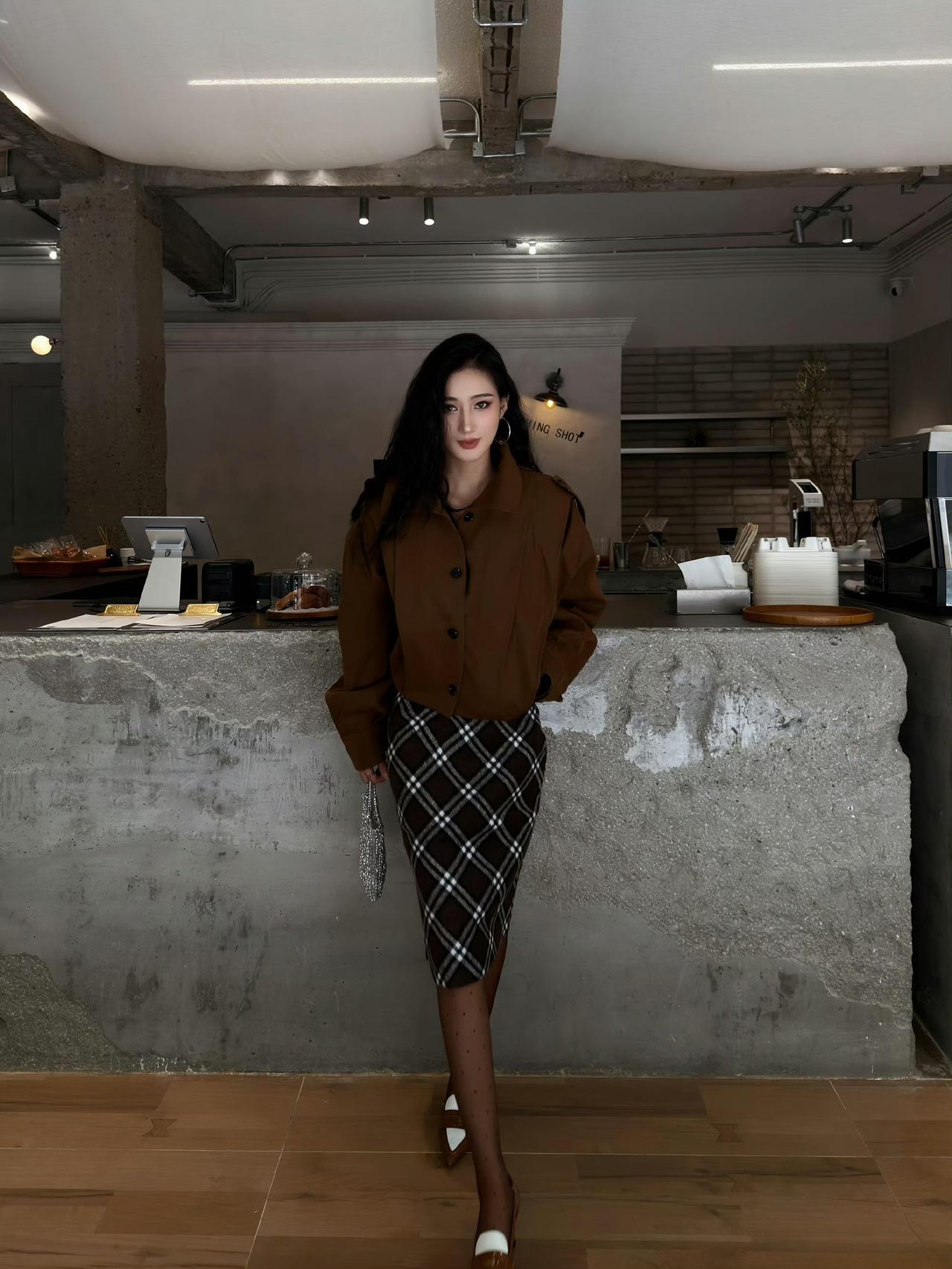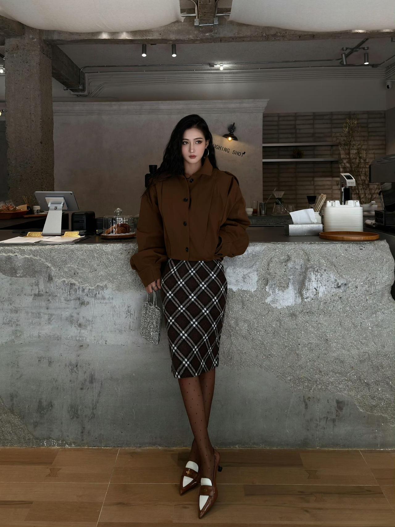 - 下装搭棕白格纹包臀裙,格纹是复古经典元素,增加甜酷细节;