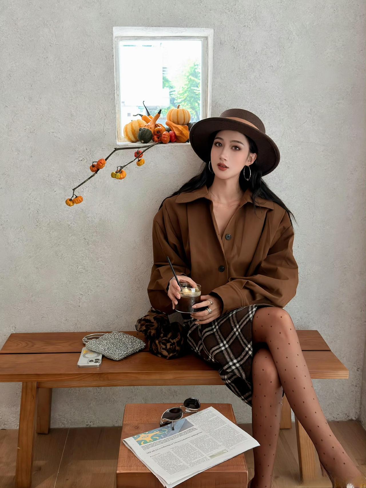 这套是“复古棕调轻熟风”穿搭,同色系搭配+格纹元素自带高级氛围: