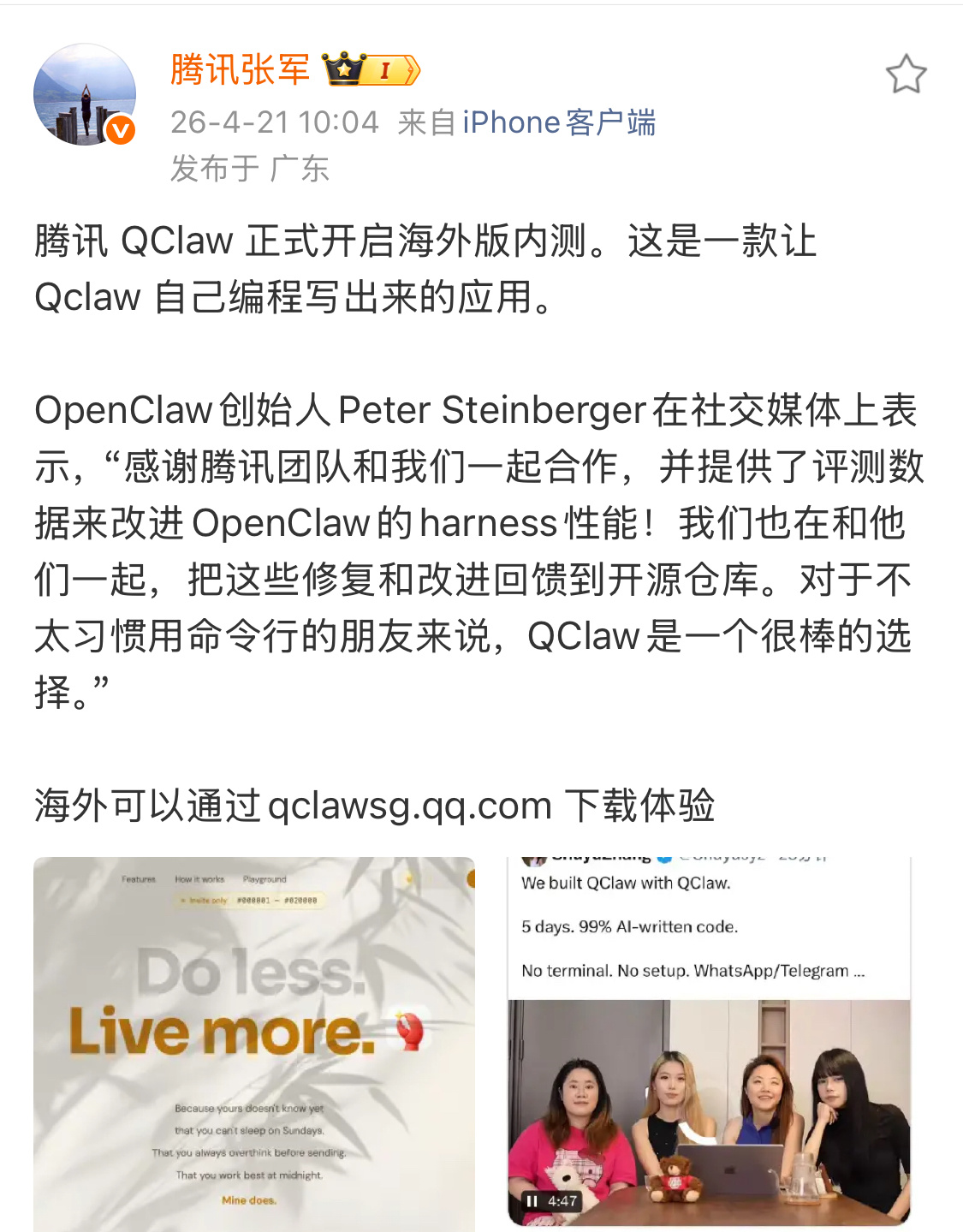 变脸真快,OpenClaw小龙虾之父发文感谢腾讯,一个月前还在质疑,为什么突然感谢?今天腾讯QClaw正式宣布,开启海外版内测,腾讯高管晒出,OpenClaw创始人Peter Steinberger对QClaw的赞美。