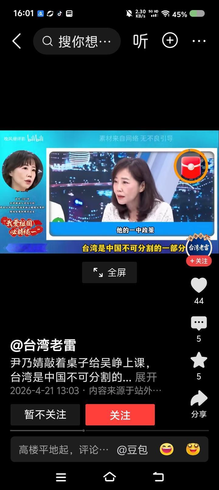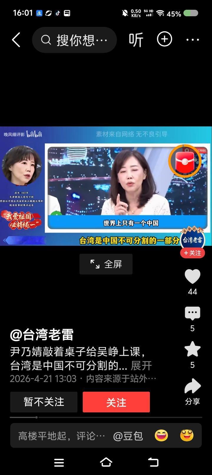 网上视频:台湾省节目里,国民党的尹乃菁当着民进党发言人吴峥的面说:“民进党的脑袋逻辑有问题,一直陷在那里出不来。‘世界上只有一个中国,台湾是中国的一部分’,这是谁的逻辑?中华人民共和国的逻辑。特朗普要去中国访问,他能反对这个吗?到中国大陆访问的那么多领导人,能不坚持‘一中政策’吗?我们也要制裁他们吗?民进党一天到晚在想什么?根据我们的法律,两岸不是一个中国吗?《两岸人民关系条例》第一句是什么?分裂国土就是违法行为。”