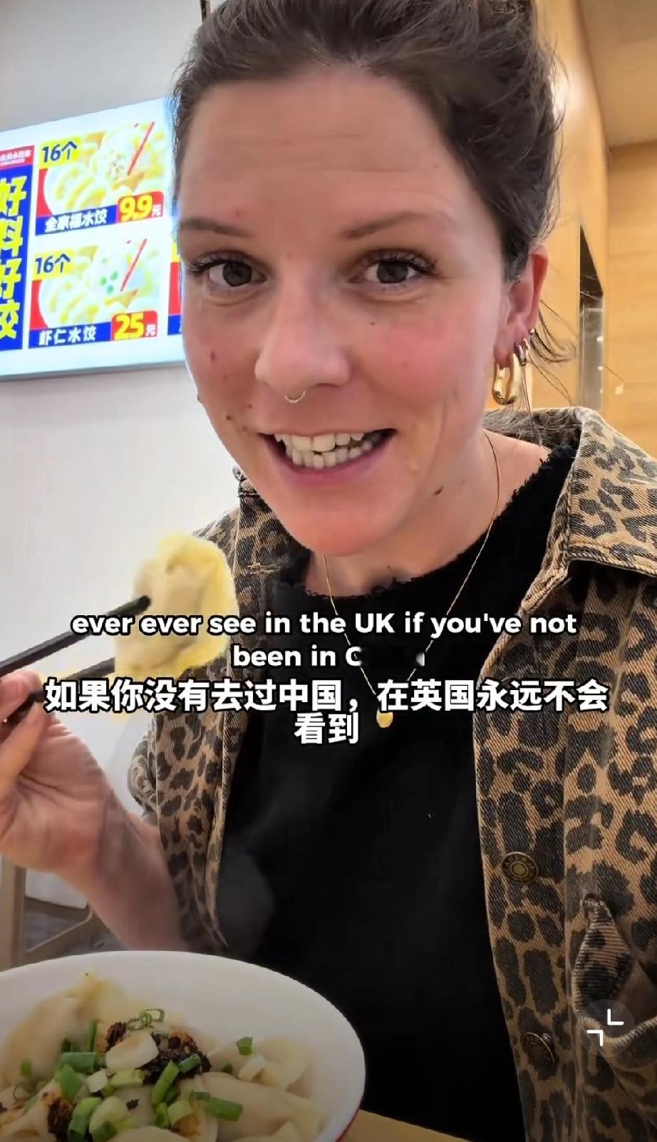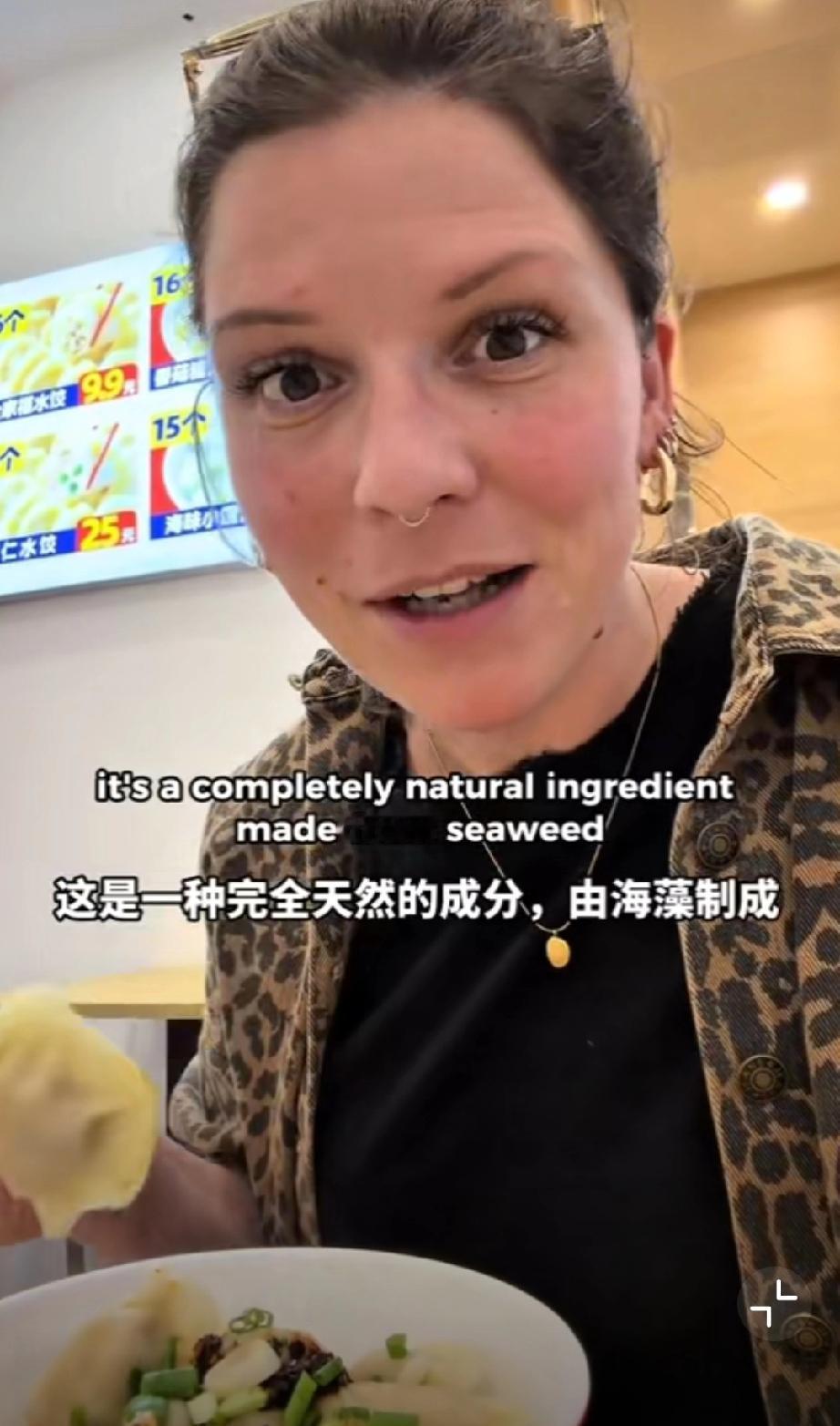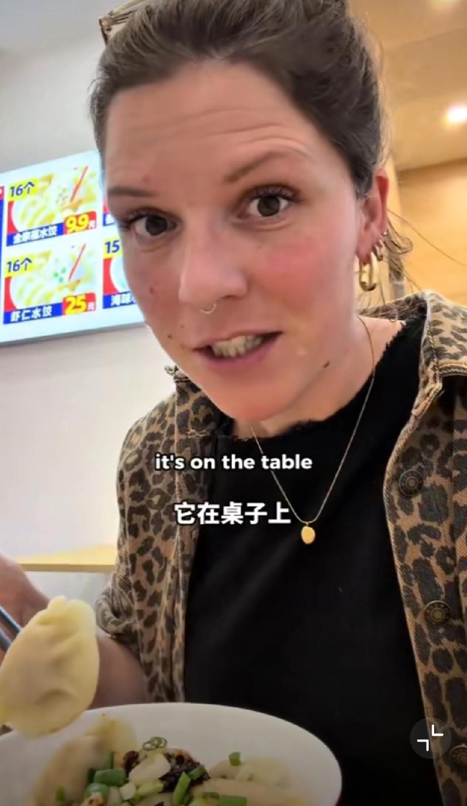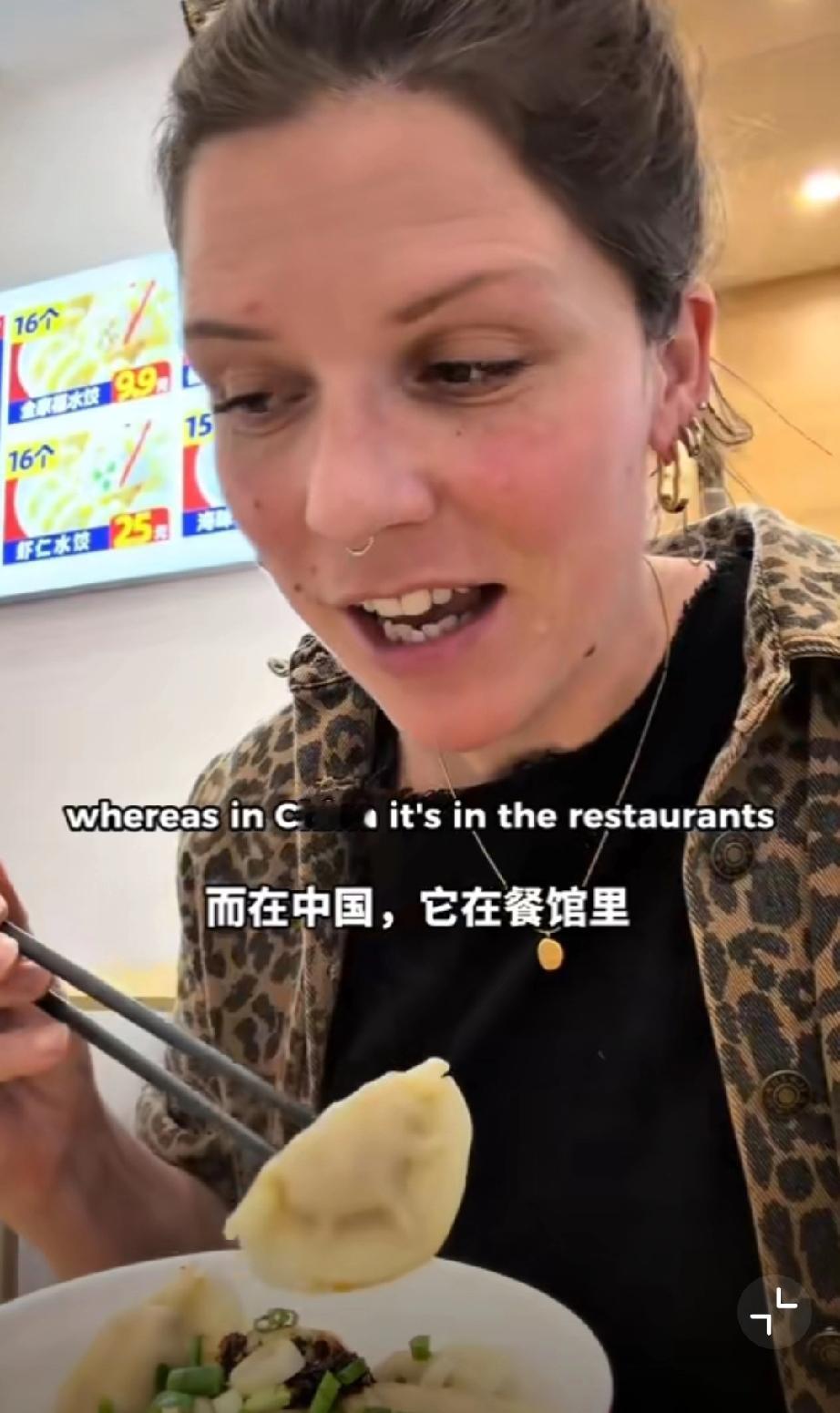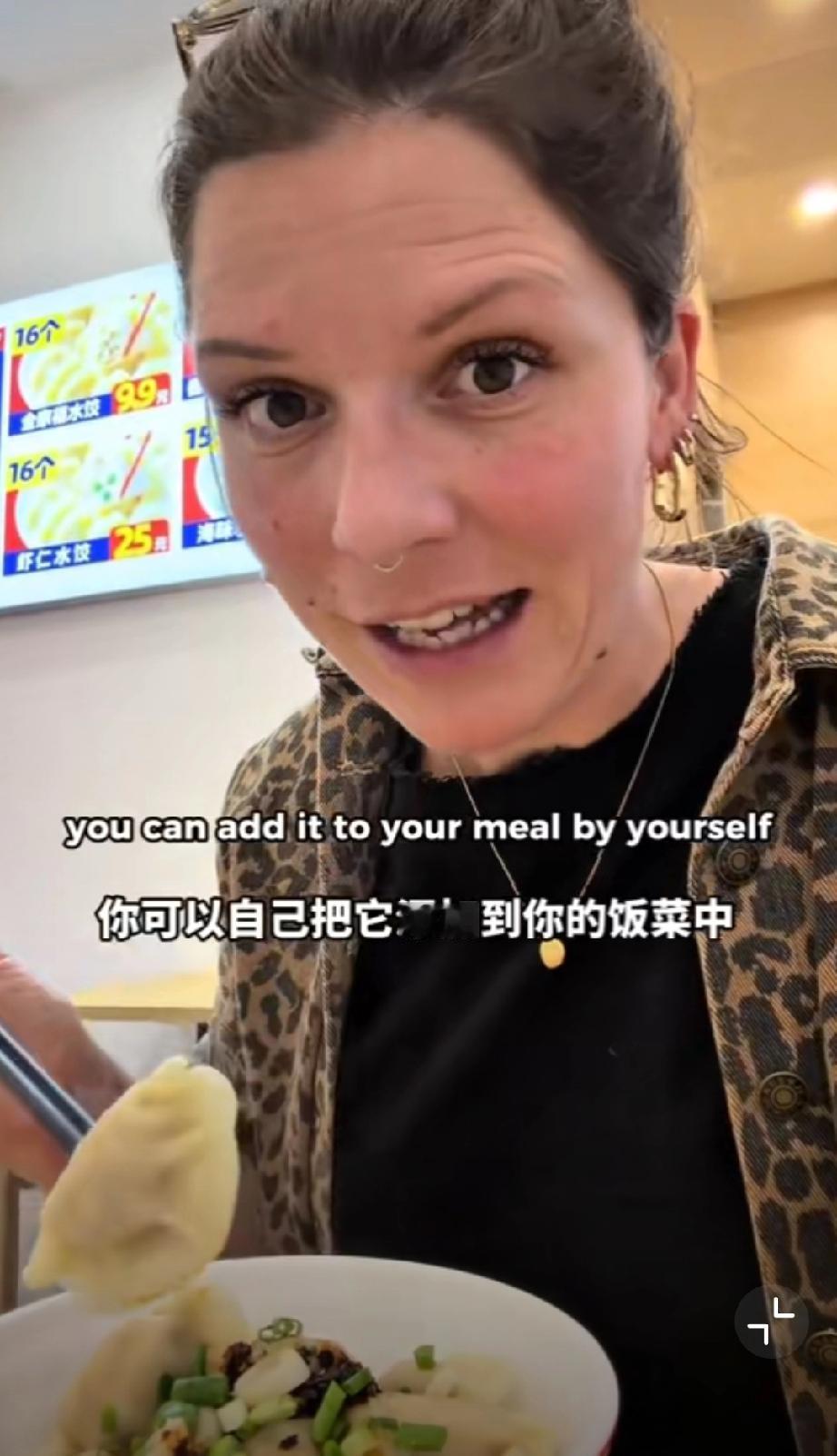 这个外国网友在中国吃饺子,她吐槽看到了在英国永远看不到的东西,那就调味的味精,外