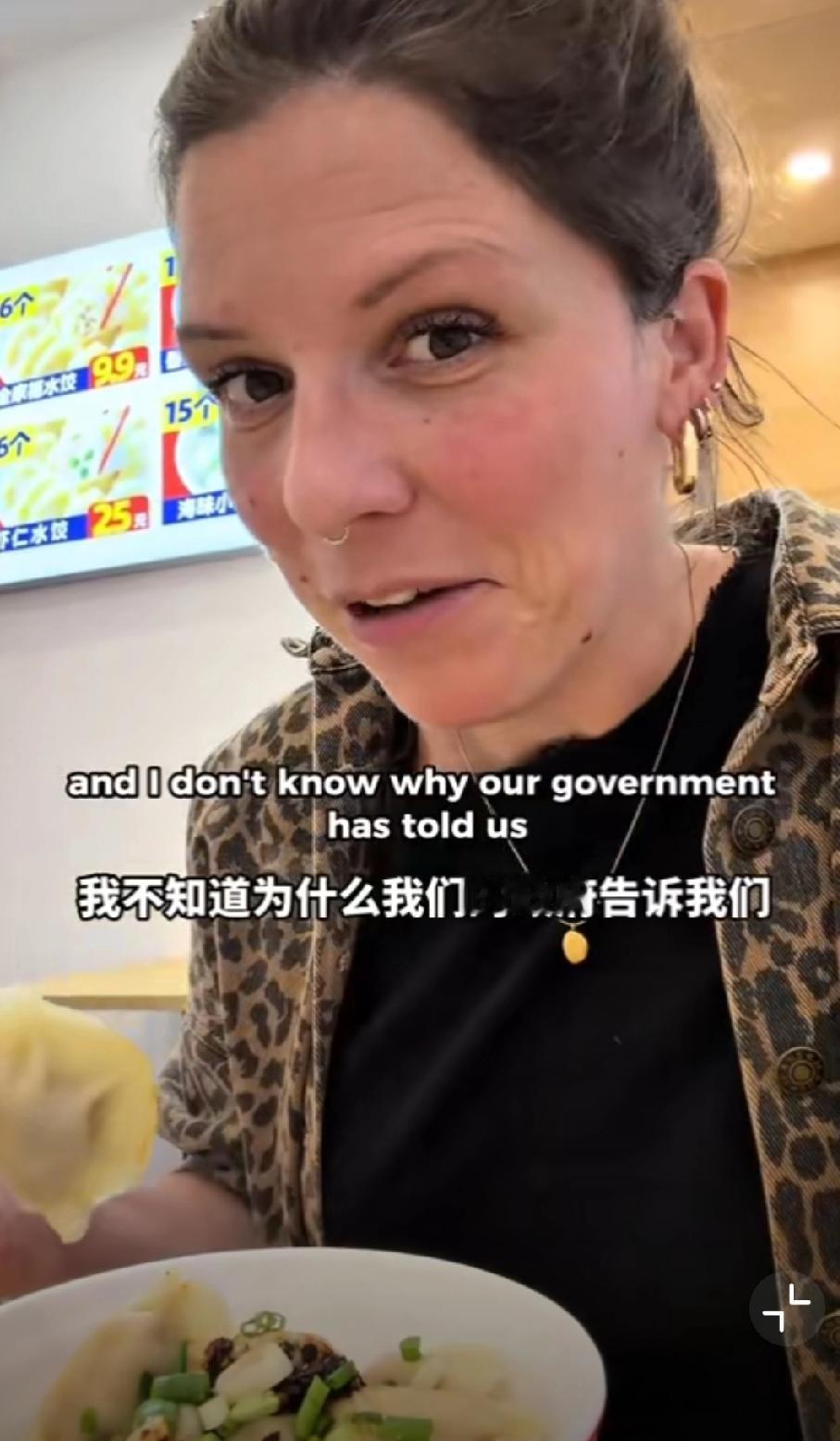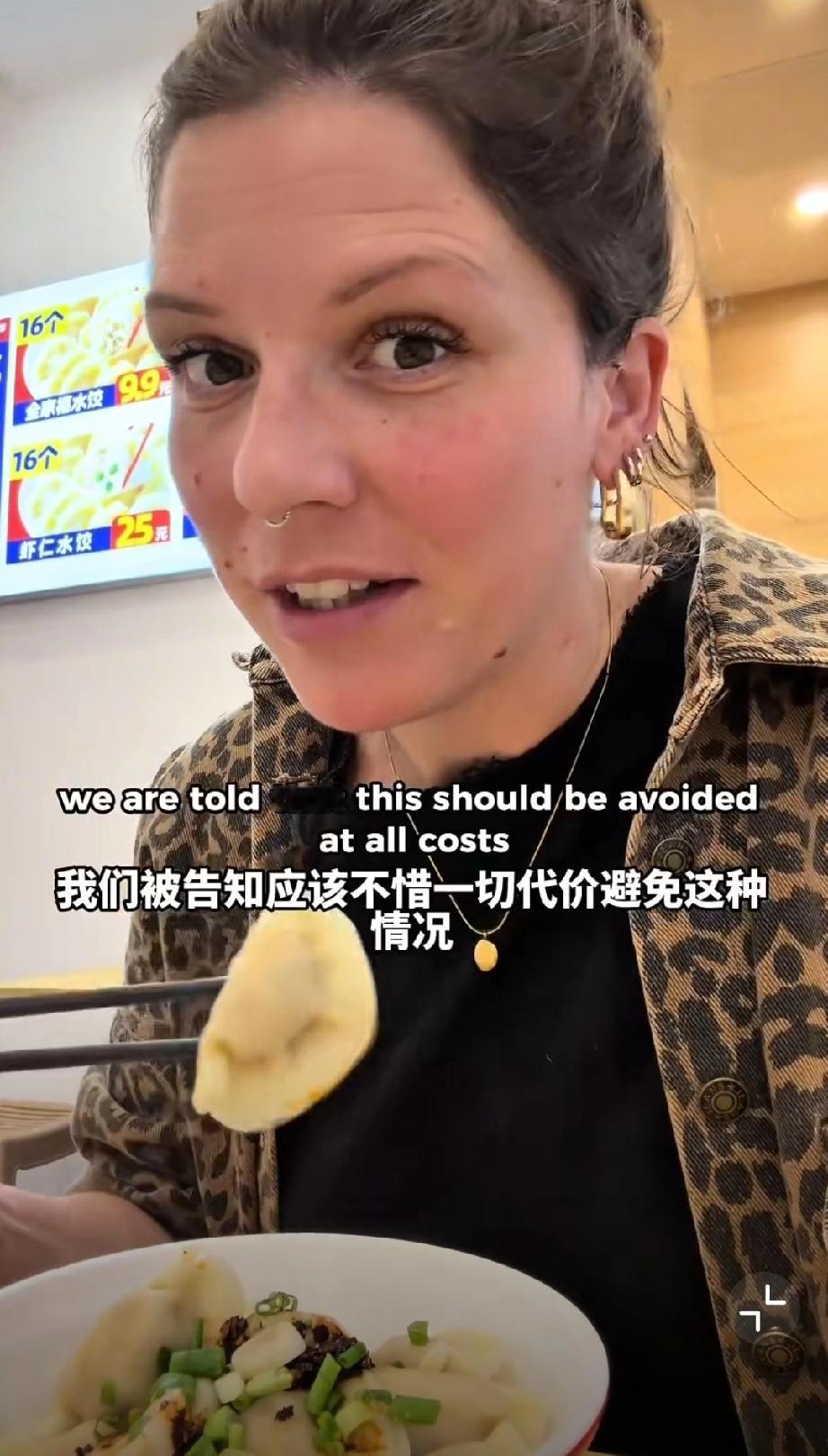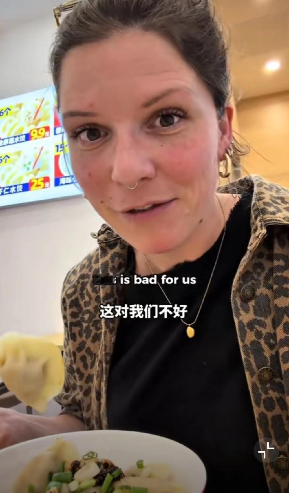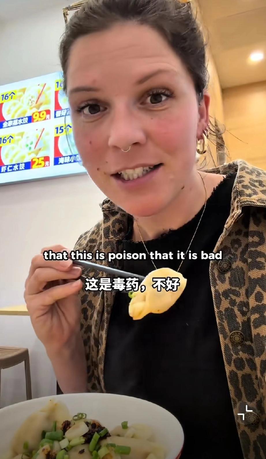 这个外国网友在中国吃饺子,她吐槽看到了在英国永远看不到的东西,那就调味的味精,外