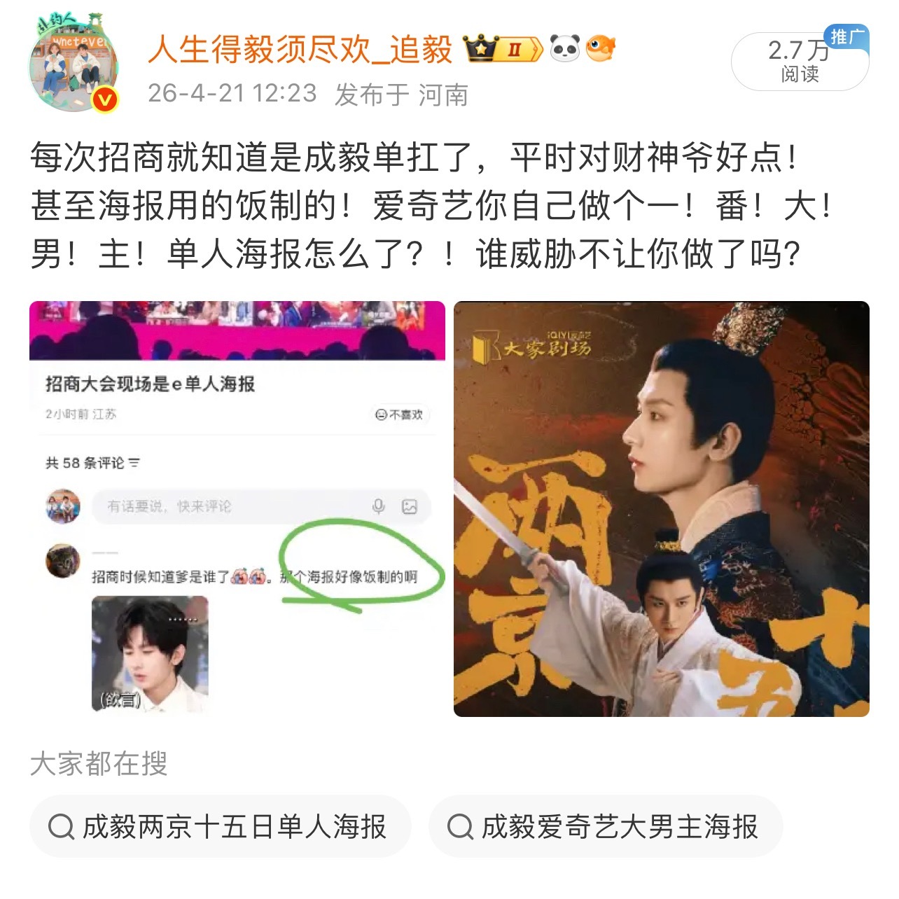 爱奇艺自己招商用的成毅两京十五日单人海报!不是我去求着他用的!也不是粉丝求着他用的!是他自己知道谁扛招商,自己用的!用的还是粉丝饭制的海报!我带什么节奏了!我只是提醒他,可以自己做个单人海报而已!我带什么节奏了!我是抵制谁了么?还是踩谁了?怎么就成你嘴里的pp了?! 人人都有一张嘴,那我说你是pp,你是pp,你才是!