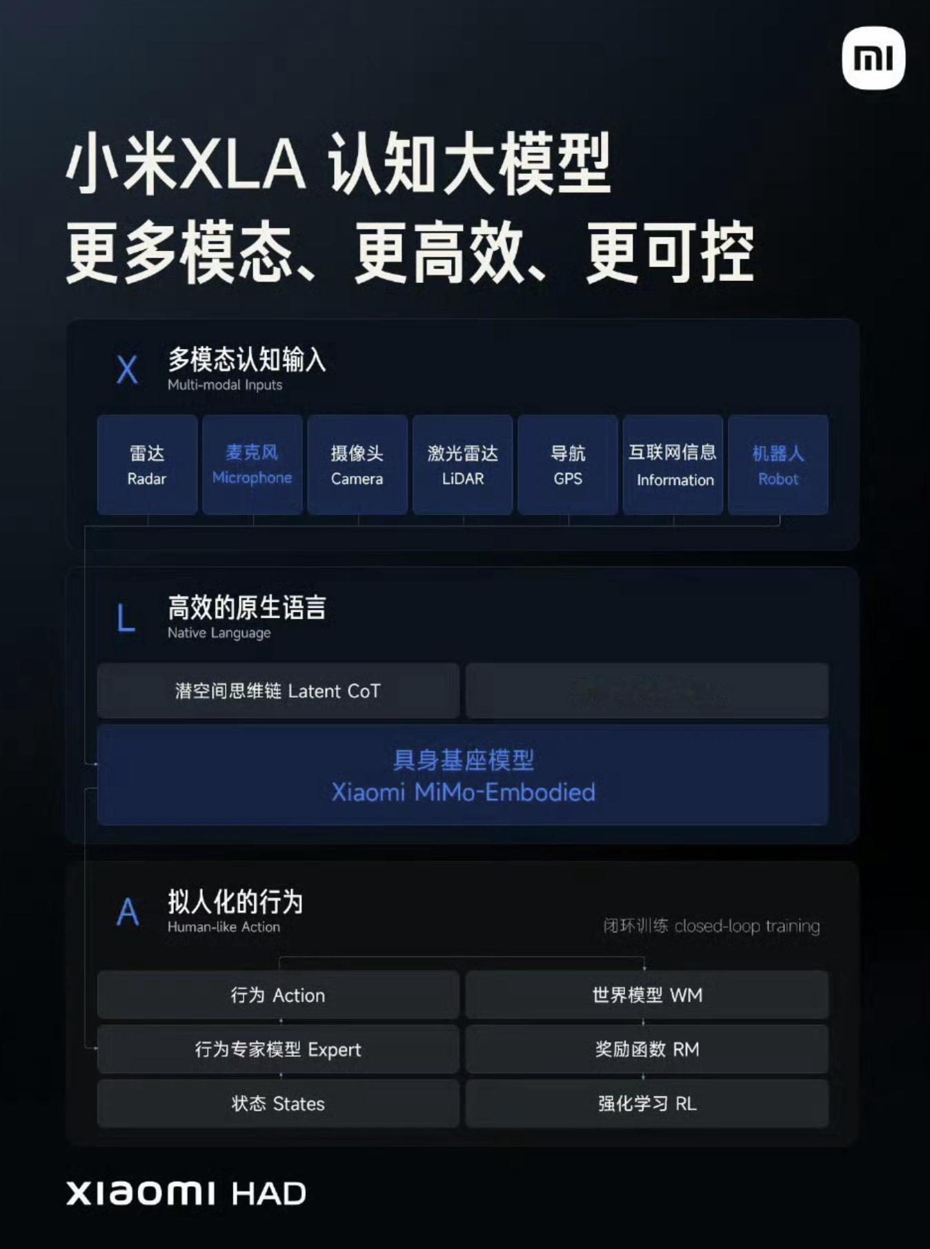 而且各家还对这套逻辑进行了优化,比如小米的XLA模型,则是在VLA的基础上扩展了激光雷达、导航等多模态输入,并且与机器人MiMo-Embodied打通,机器人的精细操作经验可以提升汽车的空间感知能力,而汽车的海量驾驶数据也能让机器人更聪明。