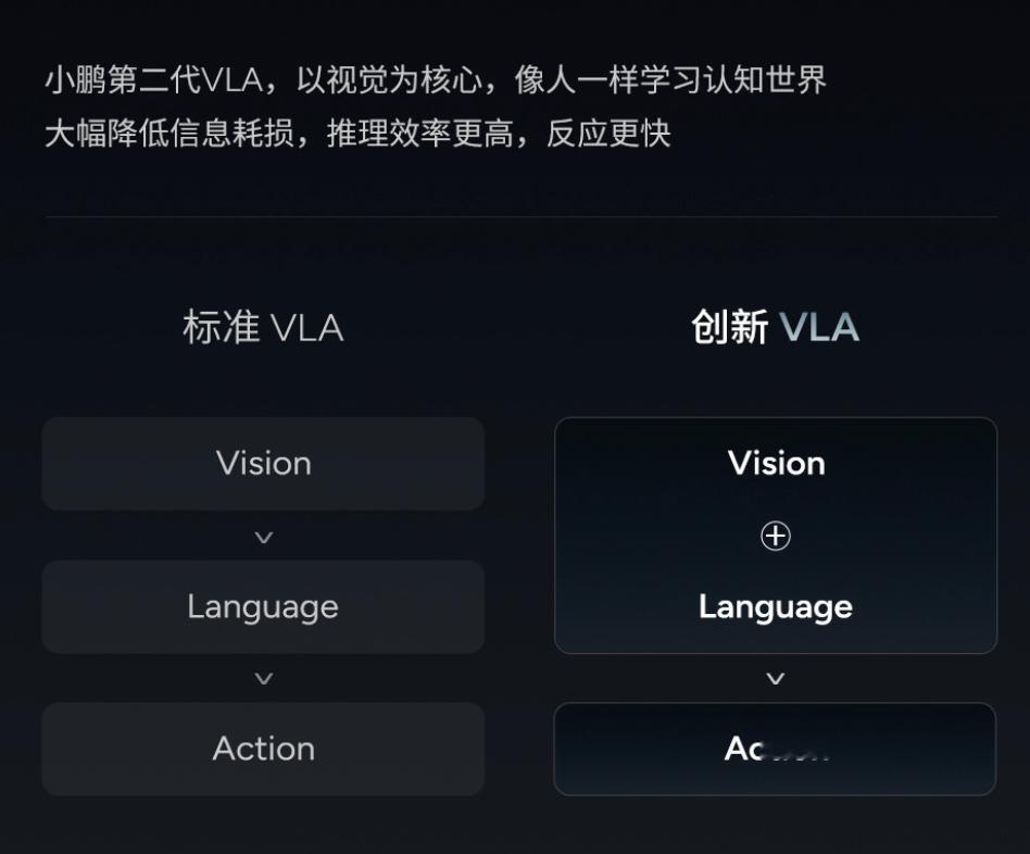 还有小鹏的第二代VLA,则是直接砍掉了“语言转译”这个中间环节,视觉与动作直链,纯视觉为主,雷达仅作安全冗余,有点类似于我们的条件反射,全链路延迟更低,并且由于是以视觉为主,所以在没有高精地图的情况下能力会更强。