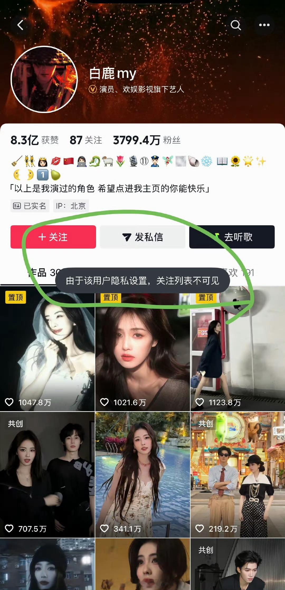 起因是早上豆瓣有人开贴说白鹿抖音取关了赵露思,后来又有人解释说关注私密后看不到了,并非取关。我去白鹿抖音主页看了一下,现在能确定的是确实关注私密后看不到了。至于有没有取关不清楚。