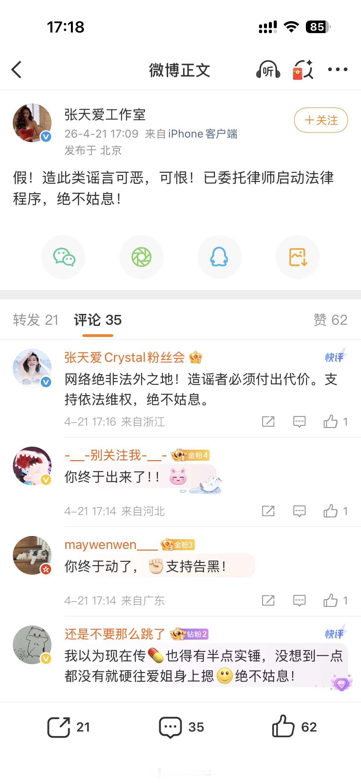 但合影也没有,聊天记录也没有,什么都没有,反正就这样爆料。现在张天爱工作室回应被造黄谣,说「假!造此类谣言可恶,可恨!已委托律师启动法律程序,绝不姑息!」