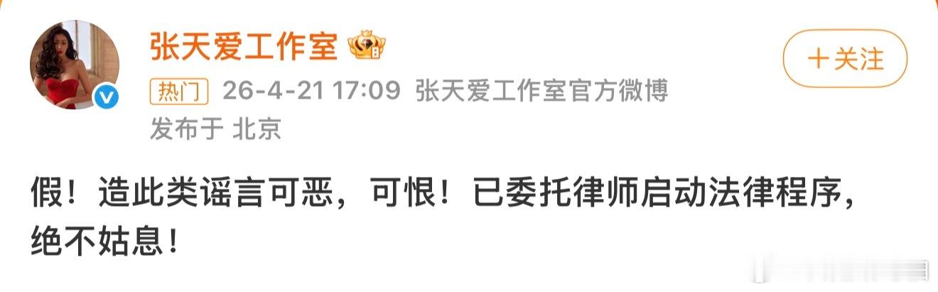张天爱工作室回应谣言:“假!造此类谣言可恶,可恨!已委托律师启动法律程序,绝不姑