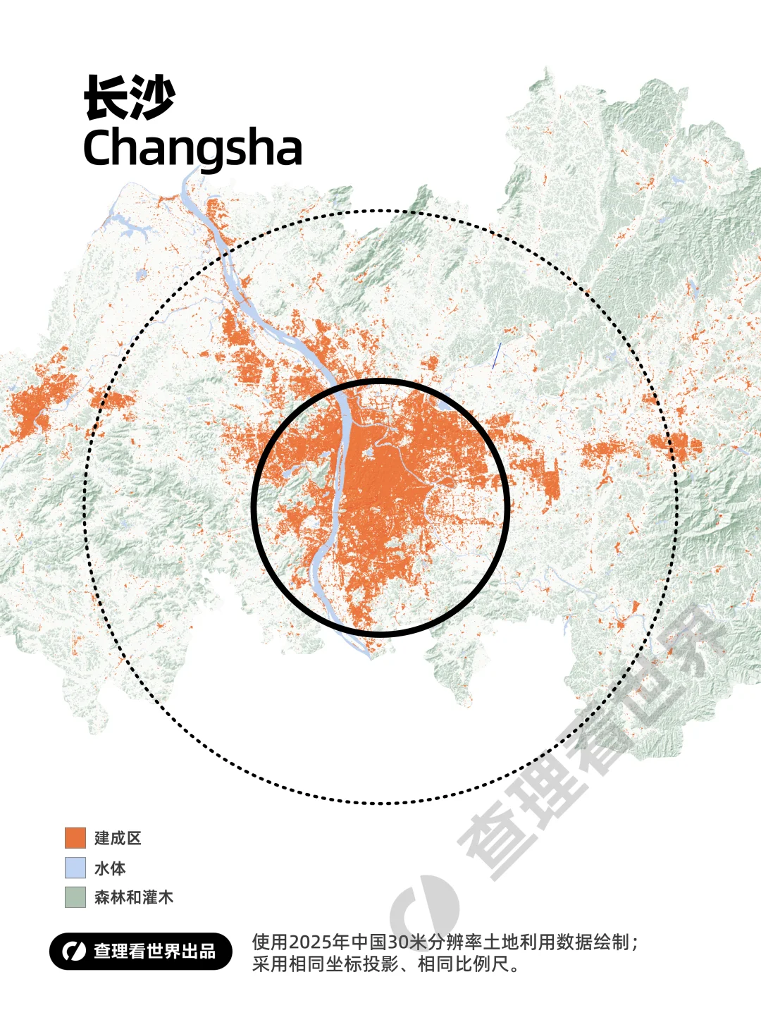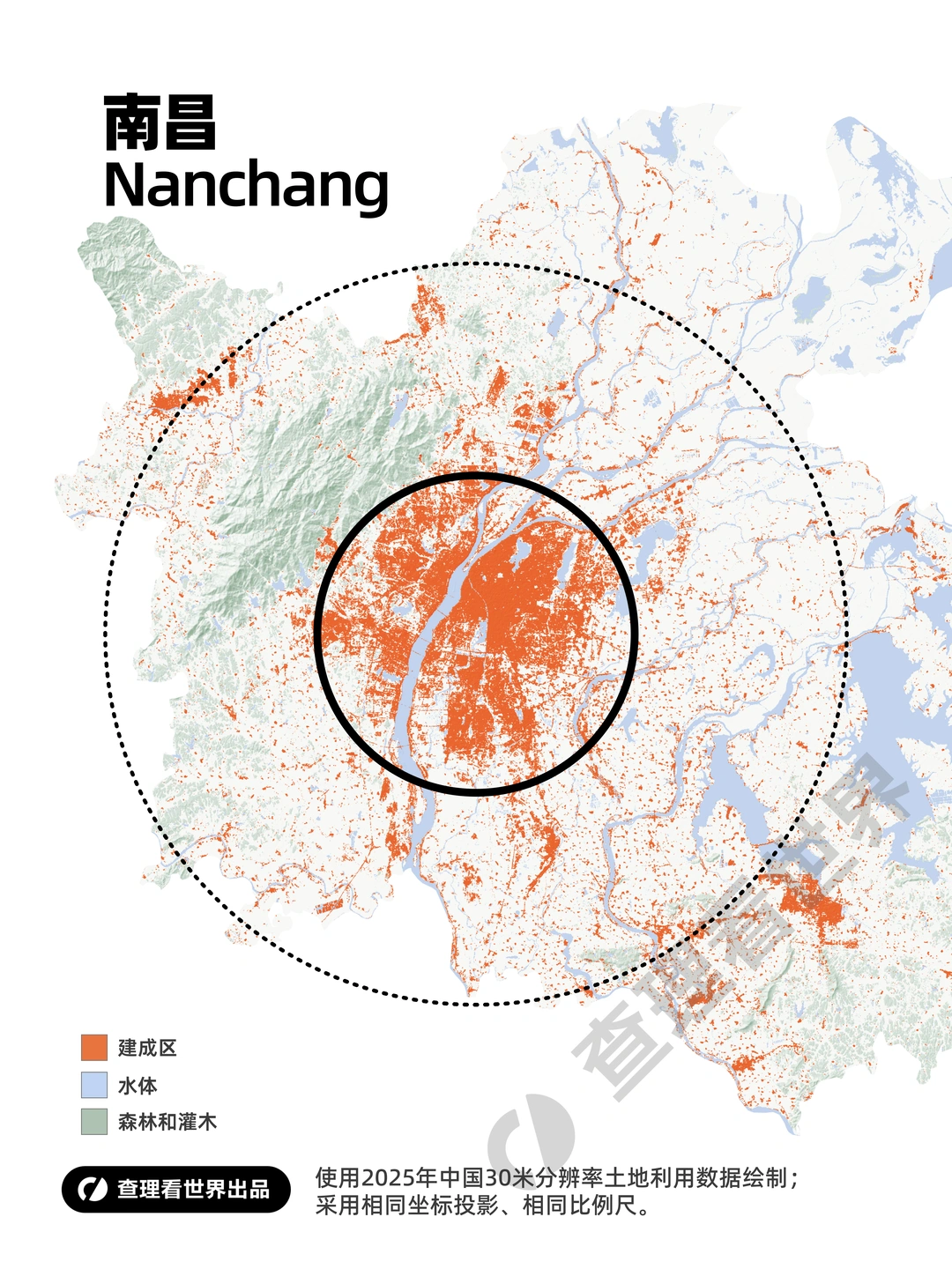 本组地图基于 2025 年全国 30 米分辨率土地利用栅格数据绘制,采用统一地图投影与相同比例尺,以完全一致的制图标准,客观评估武汉、长沙、南昌三座中部核心城市的建成区规模、空间形态与土地利用现状。同步配备同尺度北京对照底图,通过直观可视化对比,清晰呈现长江中游三大中心城市与全国标杆城市在空间格局、城区拓展尺度上的差异,为区域城镇化发展研究与城市格局对比提供严谨的可视化参考。