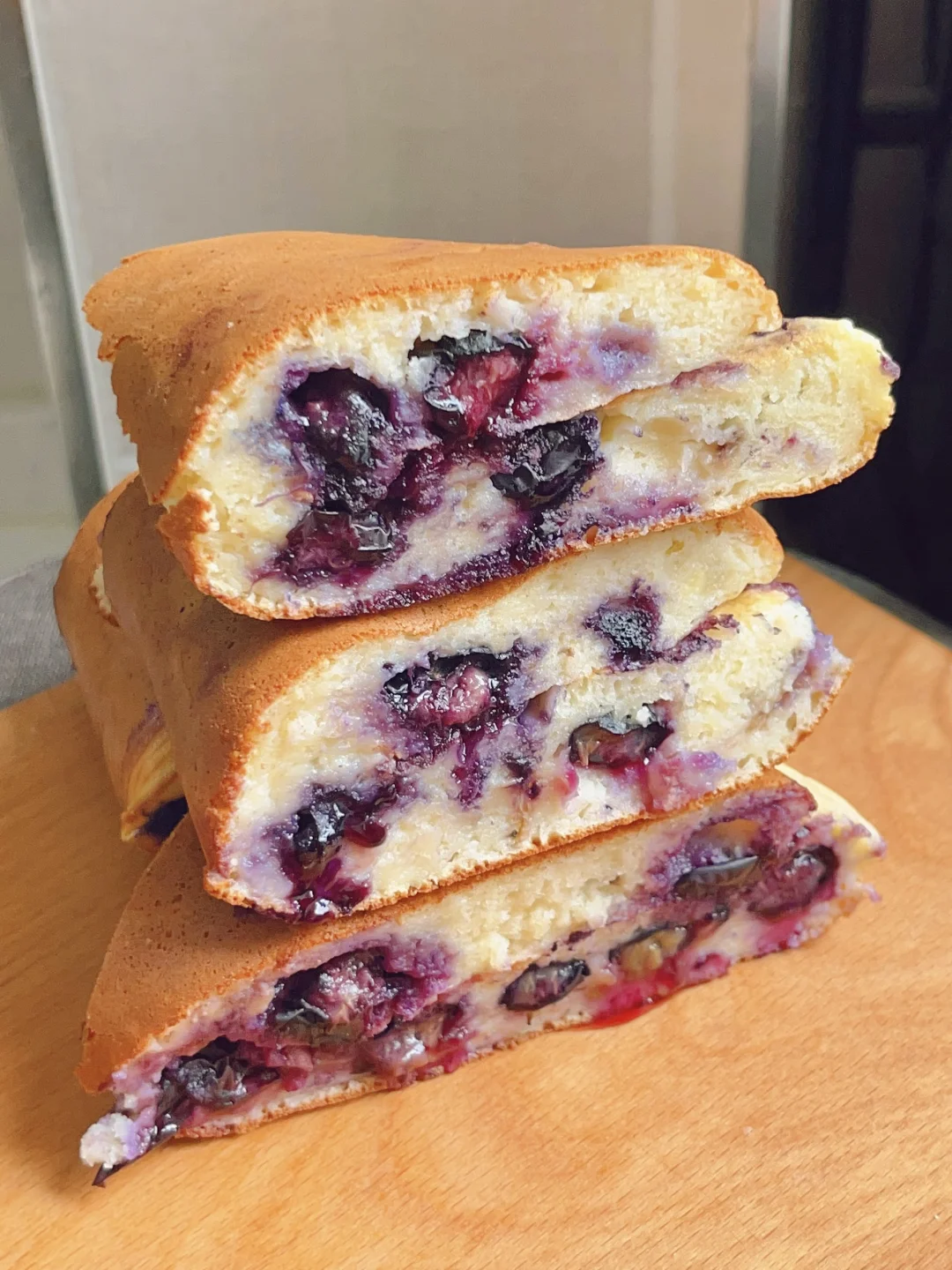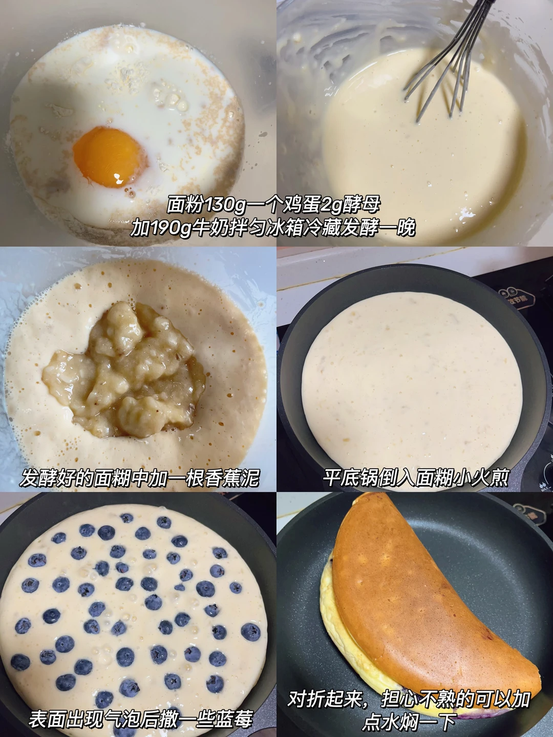 3⃣️面糊倒入平底锅,小火煎,表面出现小气泡后放上蓝莓,对折起来,担心不熟的可以加点水焖一下