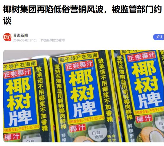 二〇一七年,椰树成立内部专门负责广告策划的机构,坚持广告必须足够直白、足够通俗,最好还带争议。二〇一九年,“我从小喝到大”成为核心广告语后,争议更是持续扩大。之后各种踩线文案层出不穷,品牌多次被罚,也多次上热搜。二〇二四年曾被罚四十万元,到了二〇二六年又因工厂标语被约谈整改。