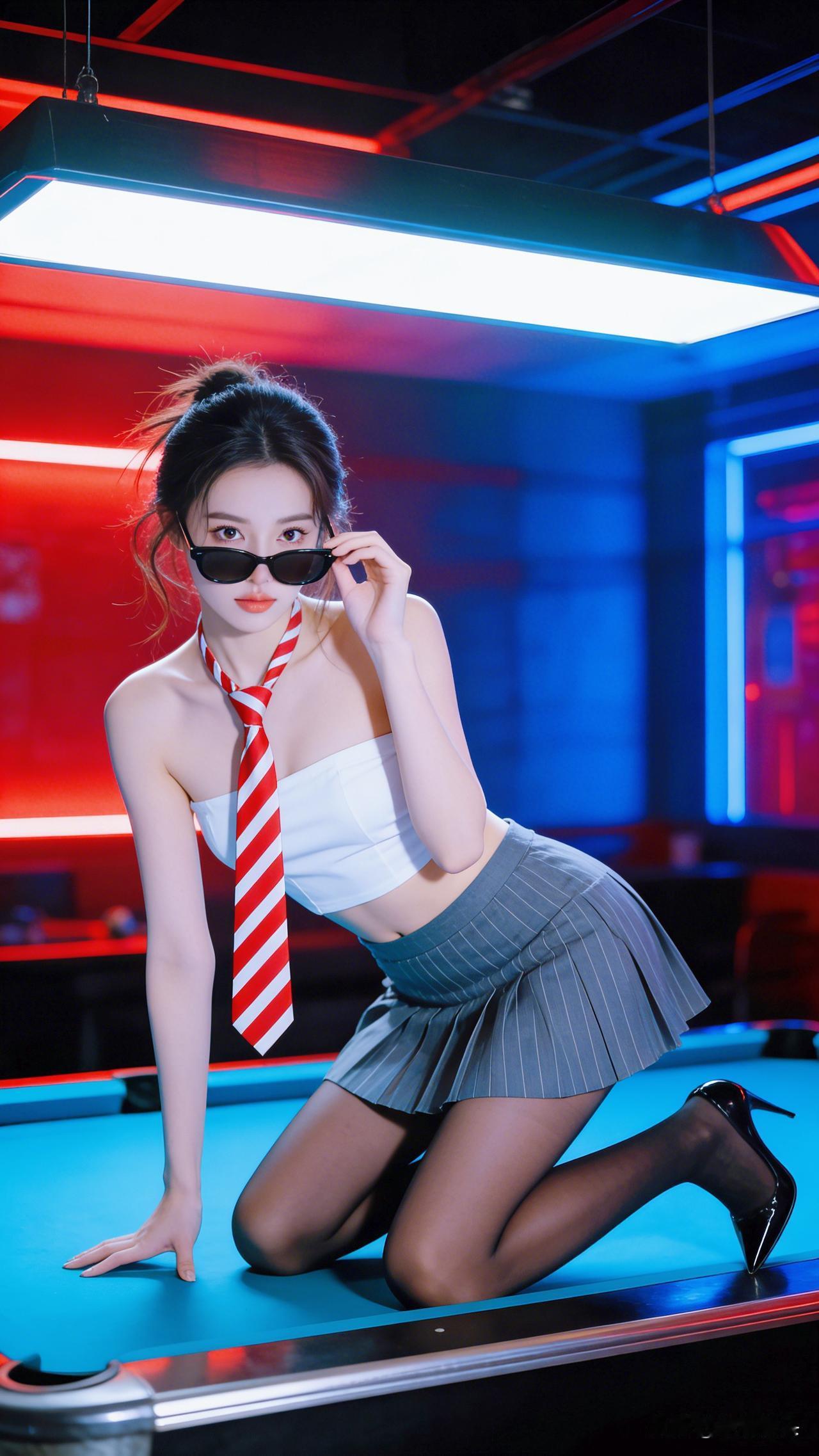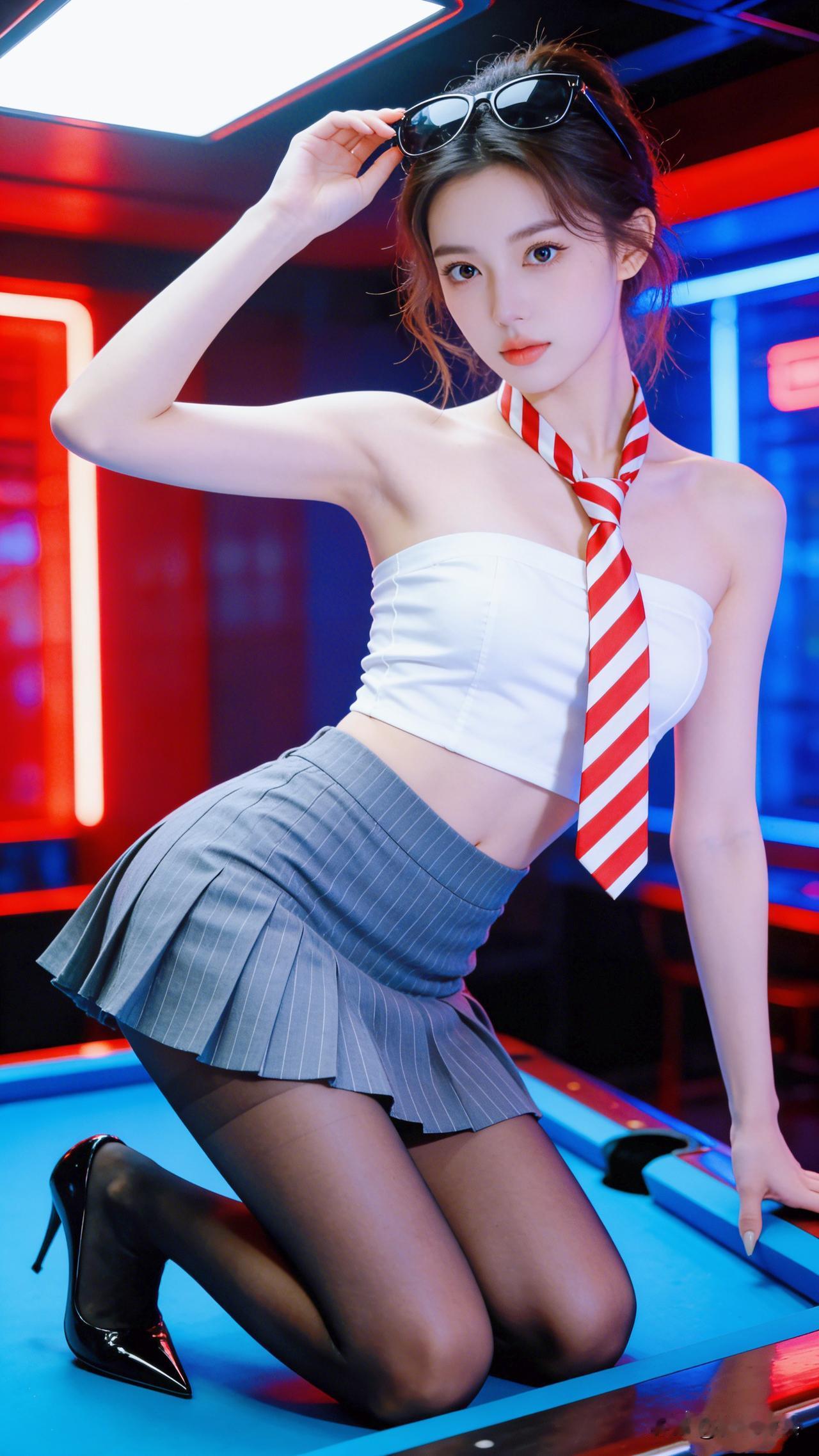 红蓝灯光下的诱惑,黑丝袜与红白条纹领带的完美搭配,尽显优雅与神秘。黑丝美腿细高跟