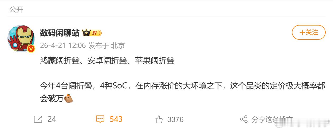 除了已经发布的华为Pura X Max和已知的苹果Fold,安卓阵营也有阔折叠屏,今年最可能的是三星和小米,明年OV应该也会跟进。根据的消息,今年的几款阔折叠定价估计都得过万。看来产品定义上,头部几家的眼光基本一致,围剿苹果,人人有责