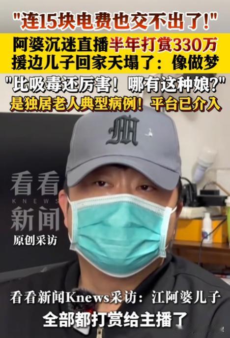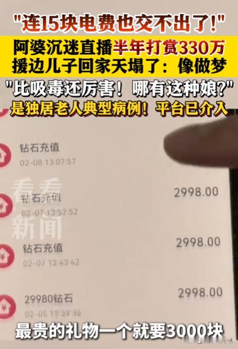 上海,一70多岁老太太在沉迷男主播后,竟将自己的养老金和儿子的积蓄共计330万元,都打赏了出去,一个月最高的时候打赏了94万元。儿子援边回家后发现,母亲竟然连15元电费都交不起。儿子认为母亲是被洗脑了,于是去找两名男主播要求退钱,但对方只回复了几句话,之后便玩消失了。无奈之下,男子向平台投诉后又报了警,但始终没有任何进展。