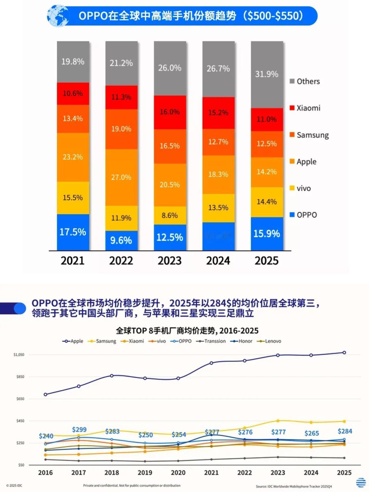 👉2025年OPPO在全球500-550美元“高端入口”价格段份额登顶第一,均价284美元稳居全球第三,仅次于苹果三星,形成三足鼎立!