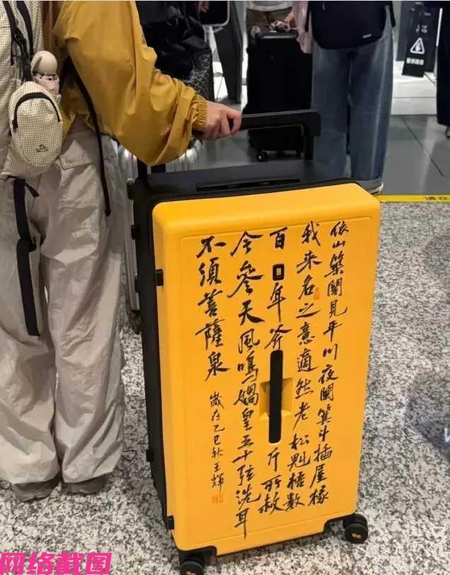 有人说看到女孩漂亮潇洒的毛笔字,谁见到都会心情舒畅,这就是我们眼里特有的惬意与浪漫情怀,可见女孩的书法功底不低,书写为黄庭坚的《松风阁诗卷》,如此特意笔墨落在自己的行李箱面上,这是一路让自己的爱好始终相随岁月,把这样的美好一直带到身边,这就是属于自己的文化,随时随刻可以看到,感受其中的美意,随心而满足。