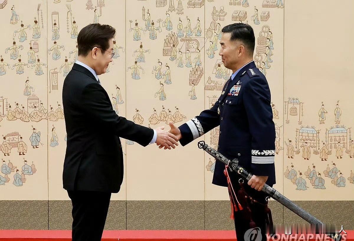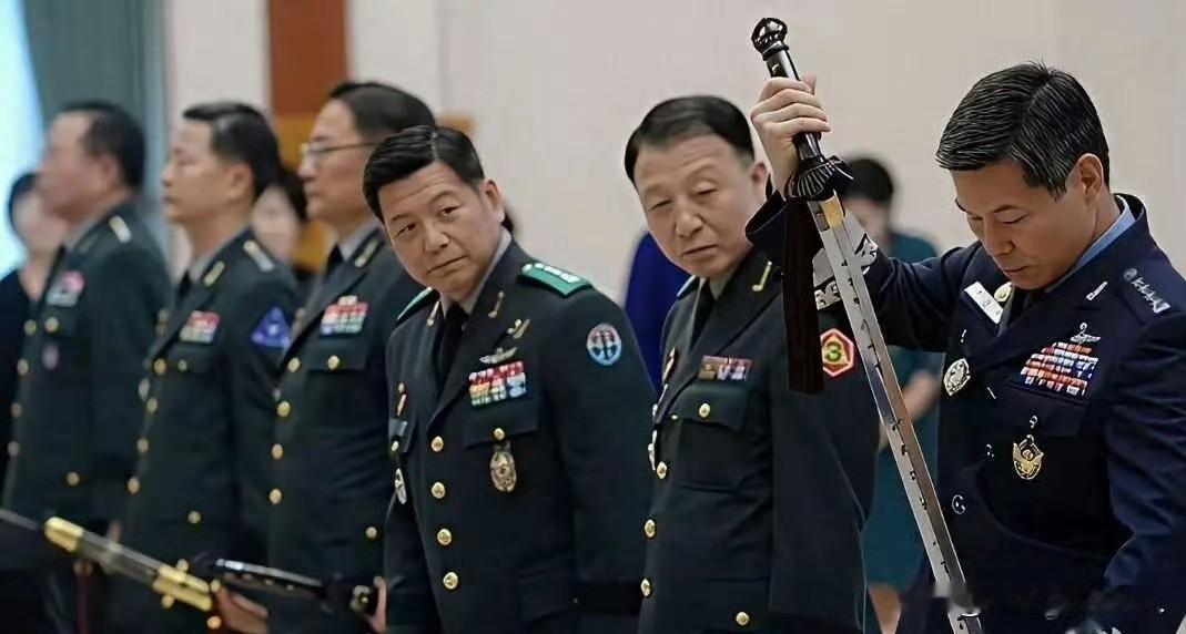我看到了韩国总统李在明向晋升的将领授予“三精剑”。