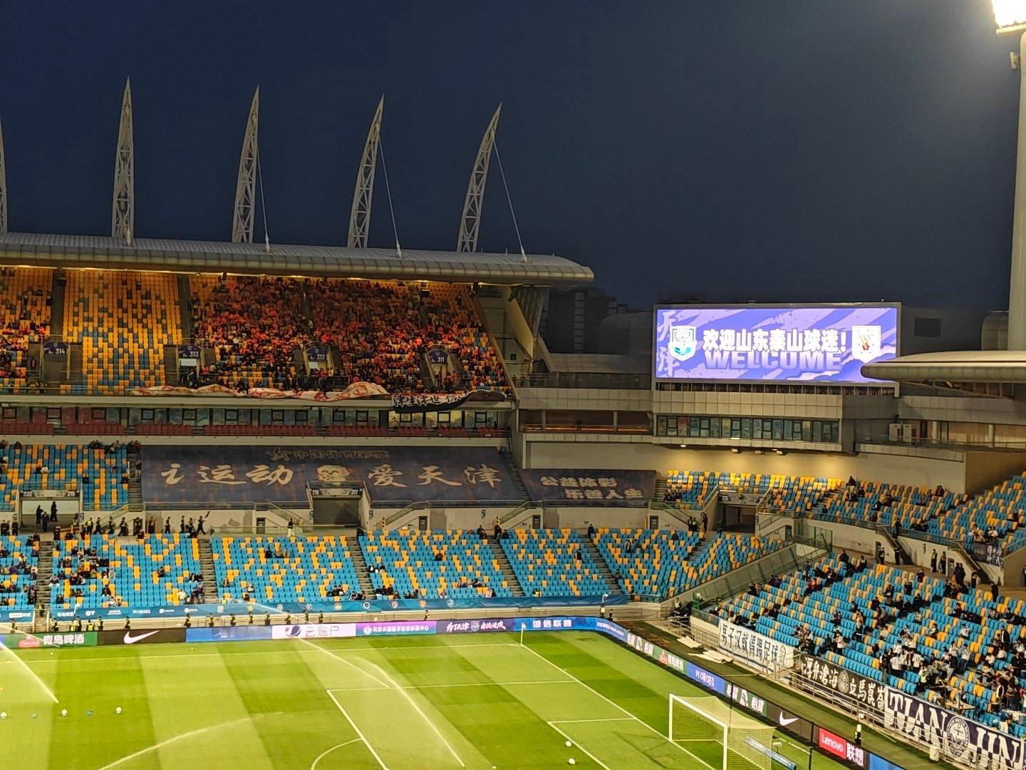 天津津门虎vs山东泰山 泰达足球场大屏幕打出:欢迎山东泰山球迷!并播放山东省省歌【相亲相爱】,排面拉满了